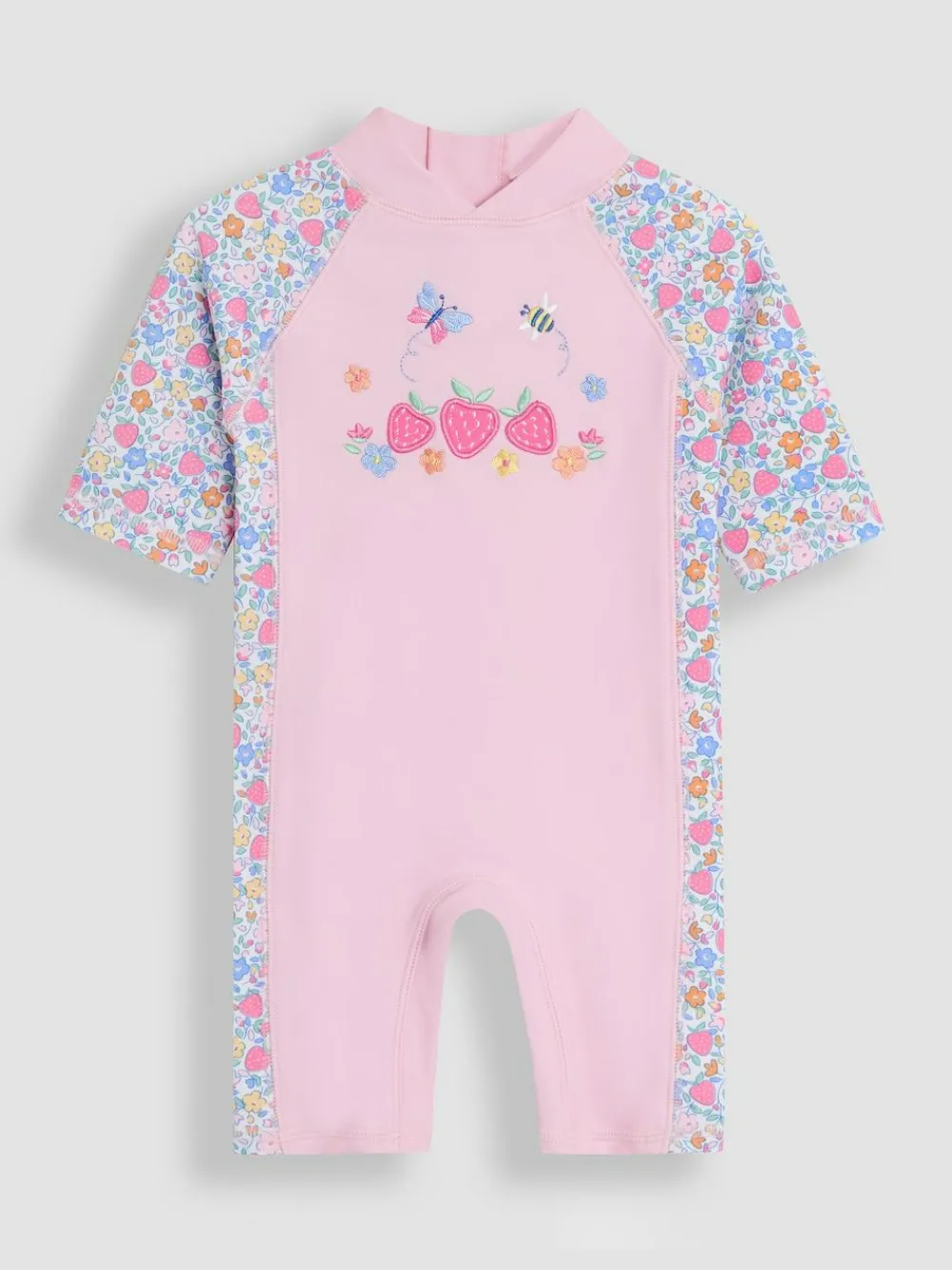 Bring strawberry sweetness to the beach with this adorable Pink Strawberry Floral Sun Protection Suit. The soft pink fabric will add a stylish touch to a seaside outfit, and the all-over floral design will make any child bloom with confidence as they play in the sand and on the water. Plus, it’s a bright pattern too, so you’ll be able to spot your child wherever they are. Wearing a Sun Protection Suit is an effective way to help protect children from harmful UV rays. Ideal for both playing in the sun and for swimming, it keeps covered areas safe from sunburn, enabling little ones to enjoy playing outside in the sun for longer. The lightweight, quick-drying fabric makes the sun suit even more practical, and the fun design will delight kids. Strawberry print UPF 50+ (98% effective at blocking UVA rays) Lightweight Quick-drying WARNING: Sun exposure causes skin damage. This item will only protect areas directly covered and, to a lesser extent, areas shaded from the sun. Only covered areas are protected; other exposed areas of the body should be protected by a high-factor sun cream The protection offered by this item may be reduced with use, or if stretched or wet. Sun exposure causes skin damage Young children are particularly at risk of sunburn because of their delicate skin, babies are especially vulnerable Keep babies out of the sun Machine washable Main 80% Recycled Nylon, 20% Elastane. Lining 92% Recycled polyester, 8% Elastane.