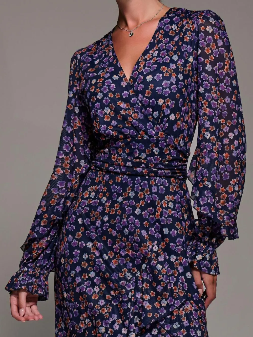 Long Sleeve Frill Detail Mesh Maxi Dress by Jolie Moi features a flattering wrap-style front with a soft V-neckline. Designed with delicate gathers at the side waistband for a beautifully draped silhouette. The skirt flows into a three-tiered frill hem with an asymmetric finish. Long sleeves are finished with elasticated cuffs that subtly flare at the wrist, adding a soft, feminine touch. Perfect for special occasions or standout evenings. Model’s height – 170cm, and wears size 8. Length – 133cm. Machine washable. 95% Polyester, 5% Elastane.