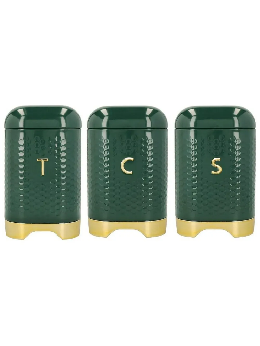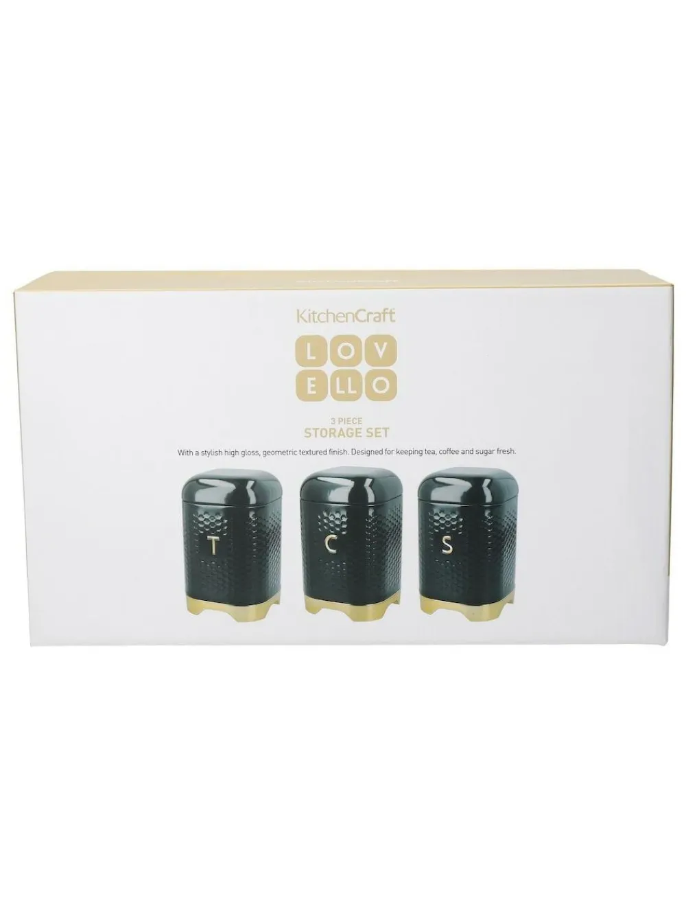 Sort your beverage storage or treat a friend with this 3-piece gift-boxed set with a stunning textured honeycomb pattern and brass-effect T, C, and S labels. Trust KitchenCraft’s Lovello Textured collection to deliver practical kitchen storage that’s easy on the eyes.This matching tea, coffee, sugar set is designed for real luxury and visual appeal in your décor.• **Capacity & Fit:** Holds plenty of tea, coffee, or sugar while fitting neatly on shelves.• **Construction:** Made of high-quality, food-safe steel with snug-fitting lids to preserve freshness.• **Design:** Embossed with the collection’s signature geometric textures, cool, retro curves, and a lush deep green finish. Each canister has gleaming, brass-effect feet and a matching T, C, or S label for easy identification.• **Space Efficiency:** Designed with lots of room inside, yet can fit neatly into corners or inside cabinets.• **Guarantee:** Includes a 12-month guarantee.• **Gifting:** Comes in a smart Lovello gift box, making it perfect for housewarmings, weddings, or any special occasion.• **Collection:** Part of the Lovello collection, curated in a coordinating modern colour palette for expanding your storage ideas.**Dimensions & Care:**• Height 33.5cm• Width 11cm• Depth 19cm• Wipe clean only Height 33.5cm Width 11cm Depth 19cm Wipe clean only. 100% Stainless steel.