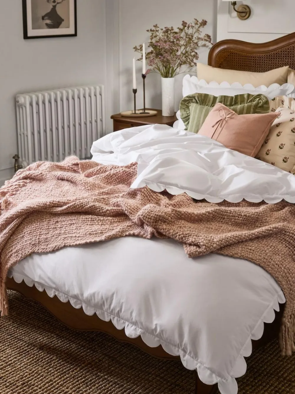 Delicate and pretty, the Scallop bed set brings a touch of elegance with its gentle embroidered scalloped edge detail. Made from a 200 thread count cotton percale this set blends classic craftsmanship with modern simplicity. 100% cotton percale 200 thread count Set includes duvet cover and 2 pillowcases (Includes 1 pillowcase with single set) 100% Cotton