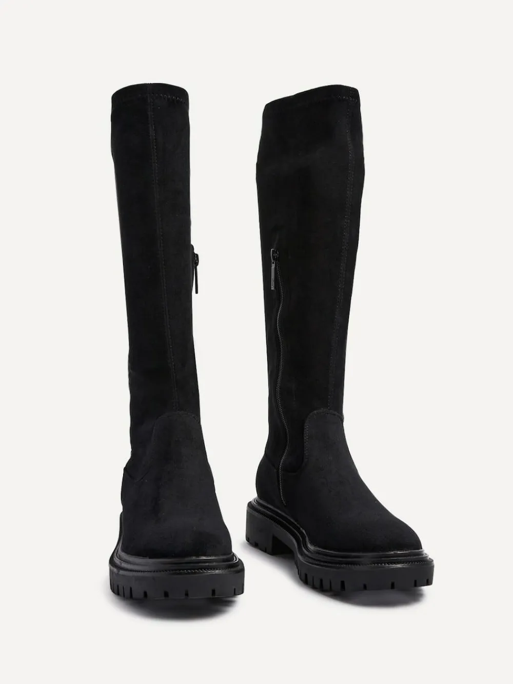 Our Best-Selling Hallie High Leg Boot is back. Its stretch faux suede seamlessly shapes your leg, ensuring a flawless fit every time. With a sturdy chunky sole and a cushioned padded in-sock, this boot offers unbeatable comfort for all-day wearability. Upper – Textile, Sole – Other Materials, Lining & Sock – Textile.