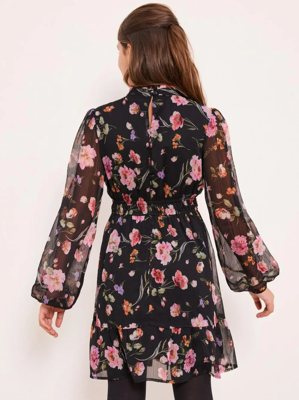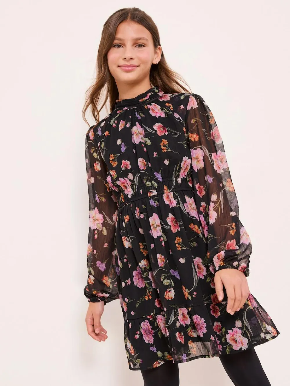 Introduce a touch of effortless style to her wardrobe with this gorgeous black floral print chiffon dress from Lipsy Girl. This dress features a striking all over print of pink and purple blooms on a sheer fabrication, creating a sophisticated look. Key details include a chic high gathered neckline, stylish long blouson sleeves with elasticated cuffs, and a elasticated shirred waist for a comfortable and defined fit. The skirt falls with a gentle volume and is finished with a tiered hemline. It is fully lined for ease of wear and fastens securely at the back with a single button and loop closure at the neck. Perfect for transitioning seasons, this dress is ideal for family celebrations, parties, or stylish weekend outings. Main 100% Polyester. Lining 100% Polyester.