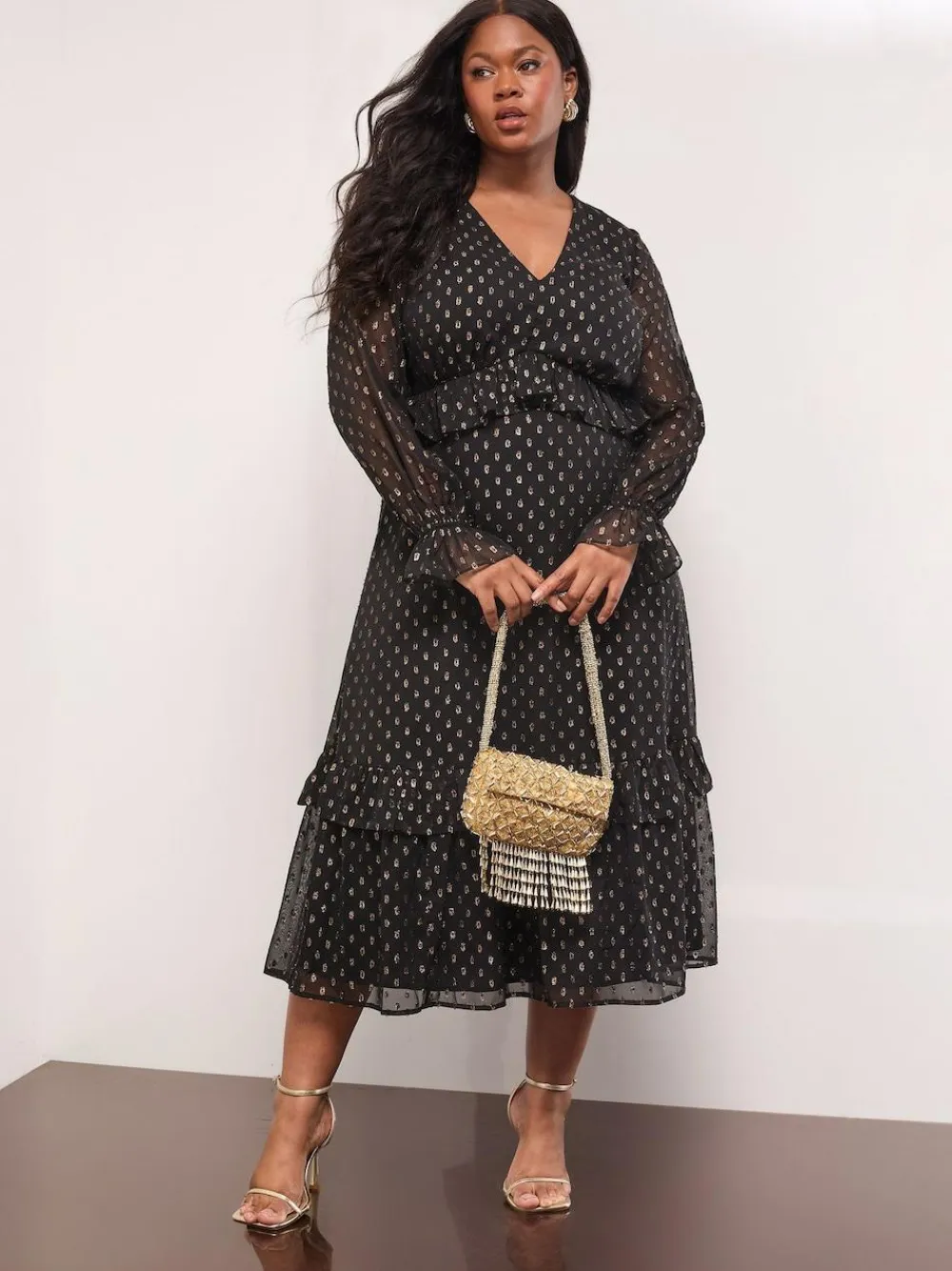 Be the best dressed this season in this gorgeous black midi dress. The sheer fabric shimmers with a delicate metallic spot print, while the flattering V-neck wrap style and dramatic tiered ruffles create a luxurious, head-turning look perfect for evening events. Metallic spot print V-neck wrap style Tiered ruffle skirt Main 95% Polyester, 5% Metallised fibre. Lining 100% Polyester.