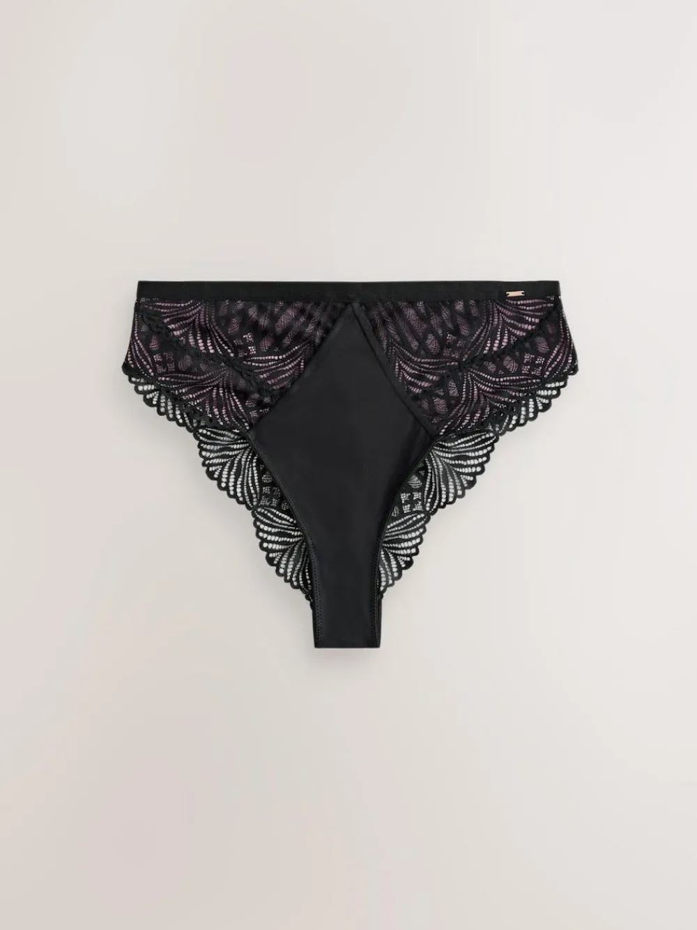 Define your silhouette with this striking high-rise knicker. Featuring a trendy high-leg cut and a flattering wide waistband, it showcases gorgeous black geo lace over a pink contrast base. Perfect for a luxurious lingerie look, its sophisticated design is finished with subtle branded hardware. High-rise, high-leg fit Geo lace detailing Branded hardware Coordinates with matching pieces Machine washable. Main 87% Nylon, 13% Elastane. Gusset 100% Cotton.