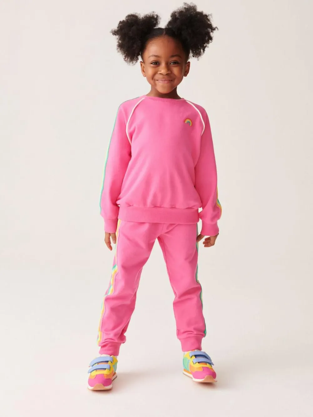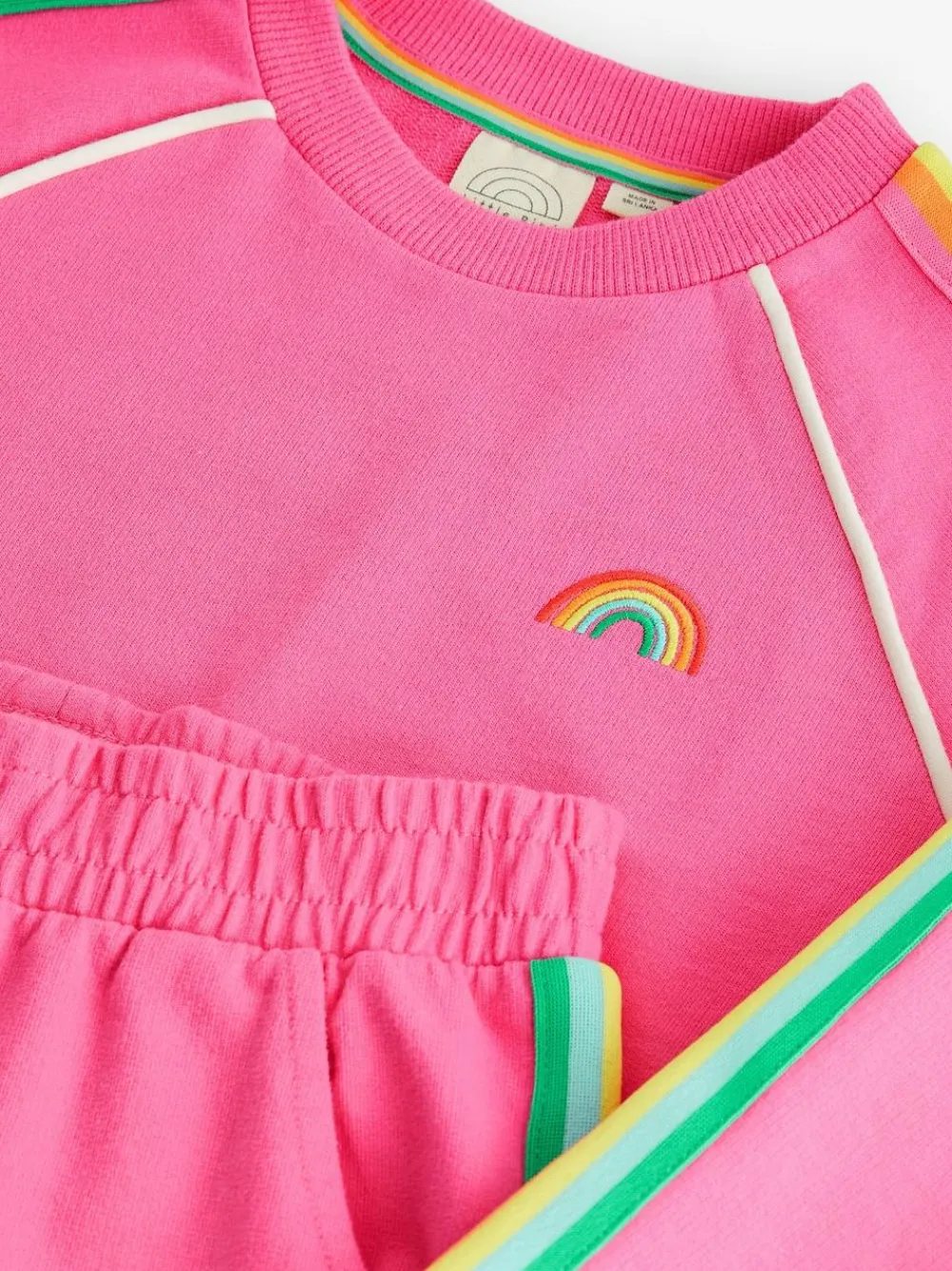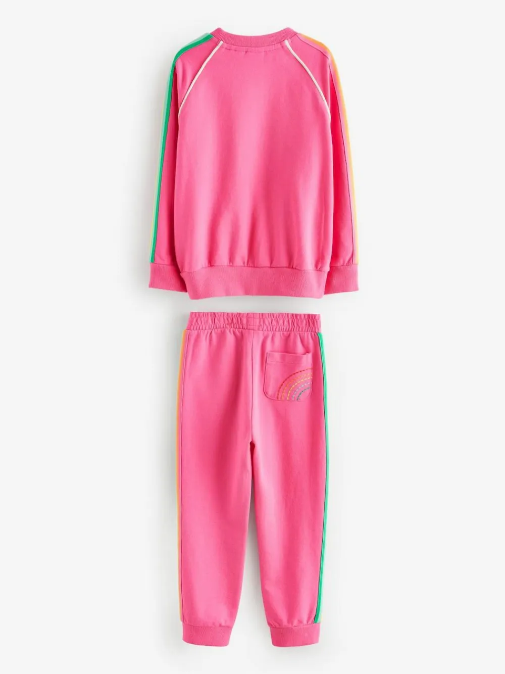 Your little one is going to love our jogger set from Little Bird by Jools Oliver. The two-piece outfit in sweet sugary pink is made from a soft and stretchy cotton and features a classic sweatshirt with a rainbow striped tape down the sleeves and rainbow embroidery on the chest. It comes with a matching pair of joggers that also have an elasticated waist for a comfortable fit. 2 piece outfit Rainbow striped tape detail Elasticated waistband Rainbow embroidery on chest Machine washable. Sweater Shell 100% Cotton. Rib 96% Cotton, 4% Elastane. Jogger Shell 100% Cotton. Trim 100% Cotton.