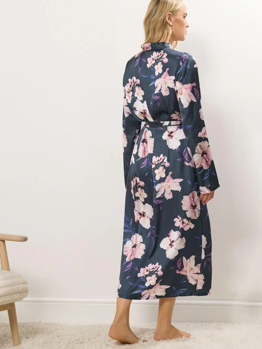 Fit & Fashion Notes: Add a touch of luxury into your nightwear collection with this new-in floral robe! Made from a soft satin fabric, it features long sleeves, a tie waist belt, an inner tie fastening, and is complete in a maxi length. Simply layer over your favourite pyjamas for your next night in. Machine washable. 100% Polyester.