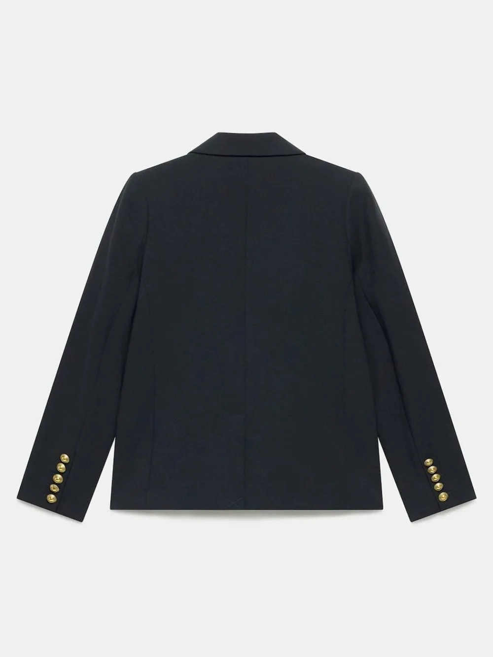 Black blazer in a double breasted silhouette with peaked lapels, long sleeves, buttoned cuffs, welt pockets, with gold-tone military-inspired buttons in a single fastening through the front. Fully lined. Dry clean only. Main 66% Polyester, 29% Viscose, 5% Elastane. Lining 95% Polyester, 5% Elastane.