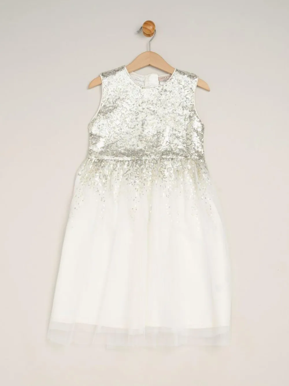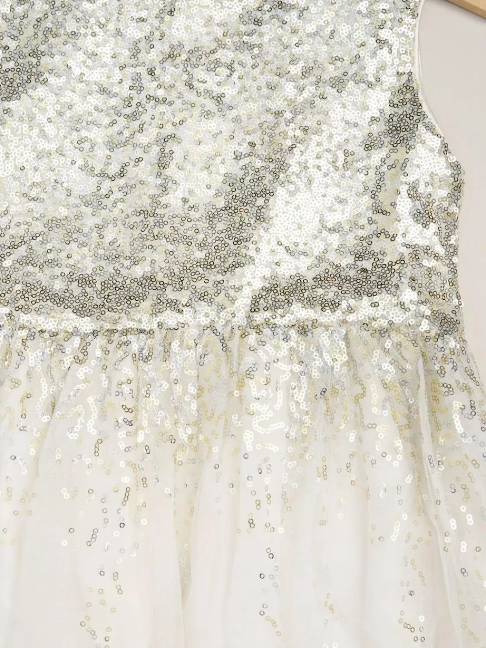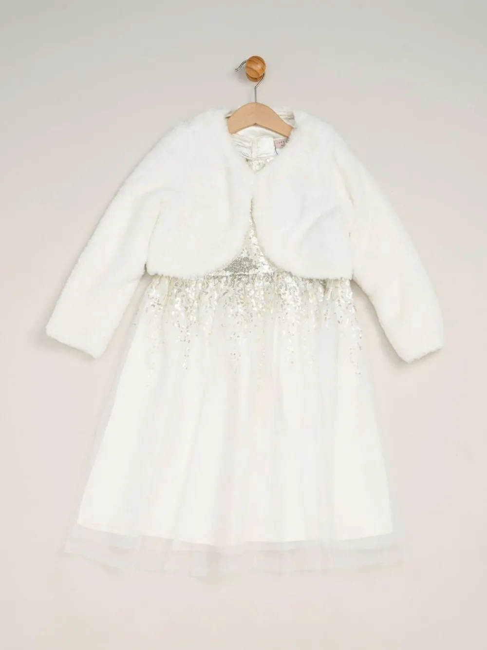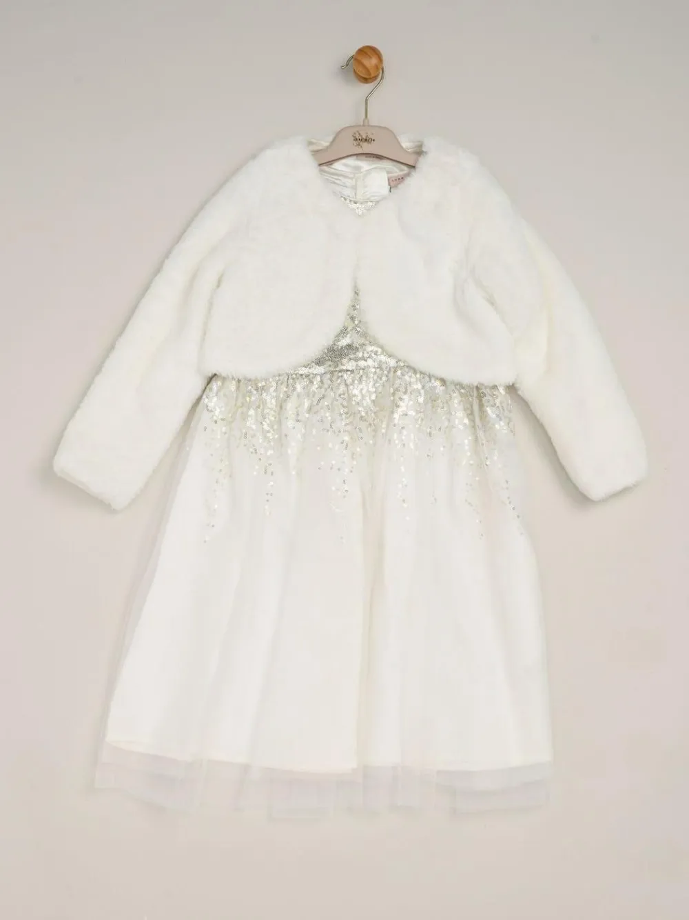 Your little one will sparkle in this dress and bolero set from Miss. The sleeveless dress features a sequin top with satin binding and a beautiful tulle skirt overlay. The set also includes a matching faux fur bolero. This style is simple and elegant, the perfect outfit for communions, christenings, and more! Machine washable. Main 100% Polyester. Lining 100% Polyester.