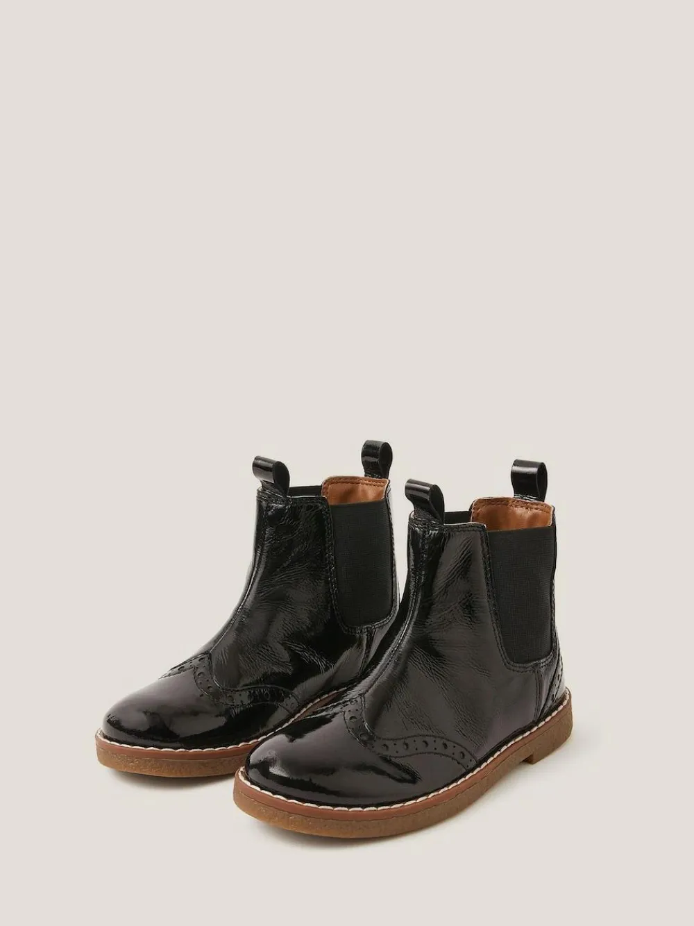 Shiny new shoe feeling (literally)! Made from leather with a patent finish, these boots cut off above the ankles with stretchy side panels and pull tabs for easy dressing. The perfect pair to slip on below all their outfits in the colder seasons. 100% Leather.