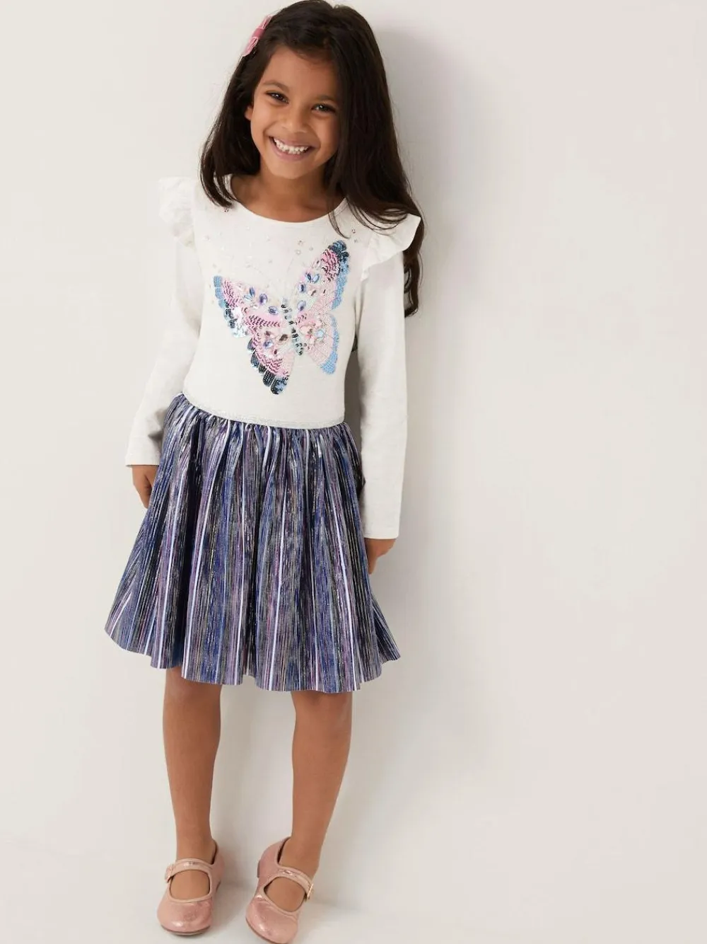 Someone s caught the sparkle bug. A fun frock ready for partying, this dress showcases an embellished butterfly design on the bodice and a colourful shimmery skirt. Finished with a back button fastening and wing-like ruffles at the shoulders. Machine washable. Lining 100% Polyester. Jersey 99% Cotton, 1% Metallised fibre.