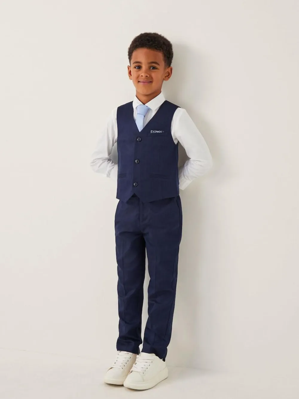 Smart choice. Featuring a plain shirt, baby blue tie, navy waistcoat and matching trousers, this suit is a top pick for any special occasion. Showcasing a herringbone finish, the waistcoat is topped with a patterned pocket square in the chest pocket to complete the look. Machine washable. Outer 64% Polyester, 34% Viscose, 2% Elastane. Lining 100% Polyester.