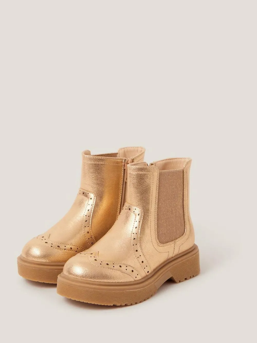 Twinkle toes. The perfect finishing touch to all their weekend looks, these Chelsea boots are cloaked in a golden metallic finish with glitzy elastic panels and an inner zip fastening. Upper – 100% Polyurethane, Lining. and Sock – 100% Polyurethane. Sole – 100% Rubber.