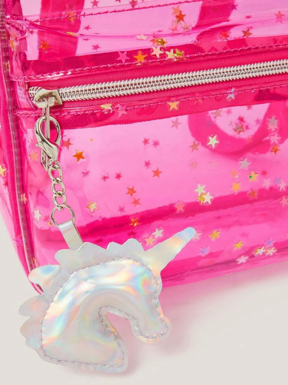 Sprinkled with stardust. Let s be clear, this backpack is going to be a favourite in the playground. Made from pink-tinted transparent fabric, it features a cute unicorn face on the front with a hologram charm on the front zip pocket. Height 29cm Width 9cm 100% PVC.