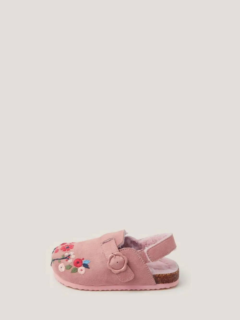 When comfort and cuteness meet. Lined with supersoft faux fur, these dusty pink clogs are decorated with colourful floral embroidery to the front. Finished with adjustable straps. Upper – 95% Polyester, 5% Metal, Lining. and Sock – 100% Polyester. Sole – 100% Rubber.