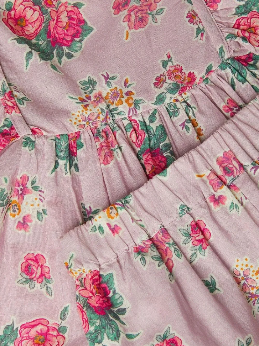 Playtime primed! Patterned with blossoming roses in pretty pink colours, this co-ord is perfect for casualwear when the sun is shining. The set includes a sleeveless smocked square neck top and frilly shorts to match. Machine washable. 100% Cotton.
