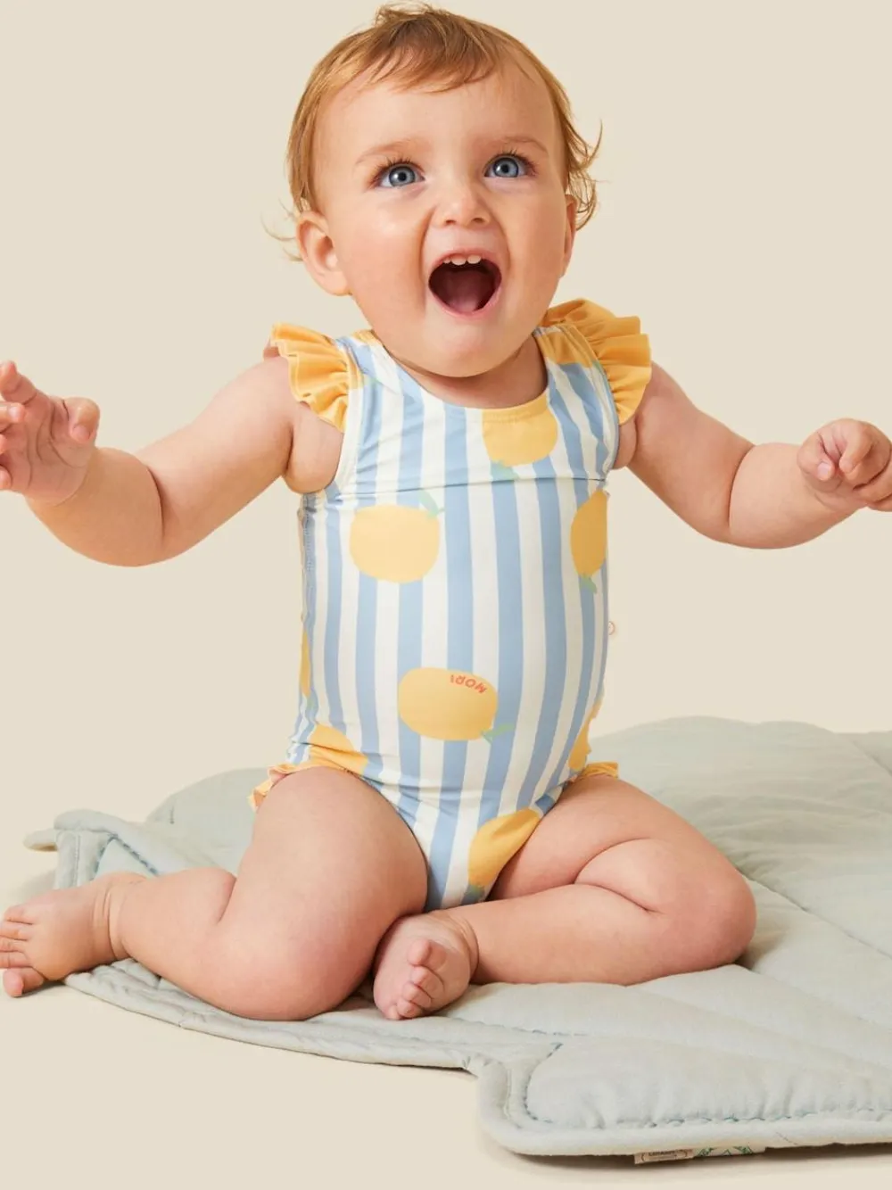 Product Description There’s nothing sour about the fun lemon-print swimsuit! It’s made from UPF 50+ rated fabric with stretch for comfort. Features: UPF 50+ protection from the sun, which blocks more than 97.5% of UV rays Poppers on gusset for quick changes Frills on the straps and legs Fabric with stretch for comfort Machine washable. 82% Polyester, 18% Elastane.
