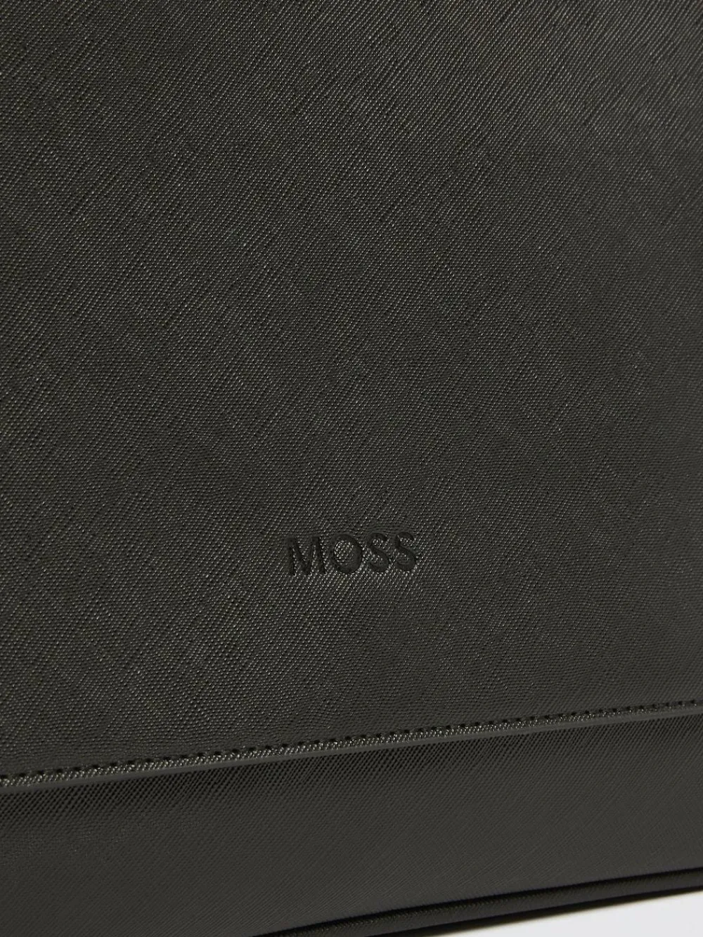 Crafted in black faux leather with a Saffiano-style structure, this dispatch bag is great for storing office documents, laptops, tablets and the like. The strap is adjustable so you can achieve a drop that works for you, while the front flap is stamped with a subtle Moss logo. 100% Polyurethane.