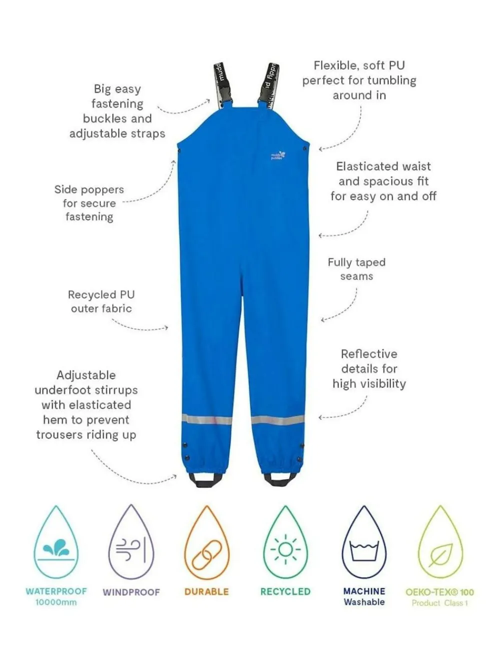 With taped seams, our fully waterproof, unlined Rainy Day bib and brace dungarees are ideal for rainy days, outdoor play and outdoor learning. They are windproof too and will keep your children warm and dry. Made from soft PU, this bib and brace is spacious, flexible and can be comfortably worn over clothing. Adjustable underfoot stirrups help prevent trousers from riding up. The Trouser cuffs are elasticated to keep out rain and wind. The buckles are big enough for little hands and the straps are fully adjustable as well as easy to fasten. They’ve designed this bib and brace with reflective details so you will easily spot your children outside. Waterproof to 10,000mm. Machine washable. 100% Polyester.