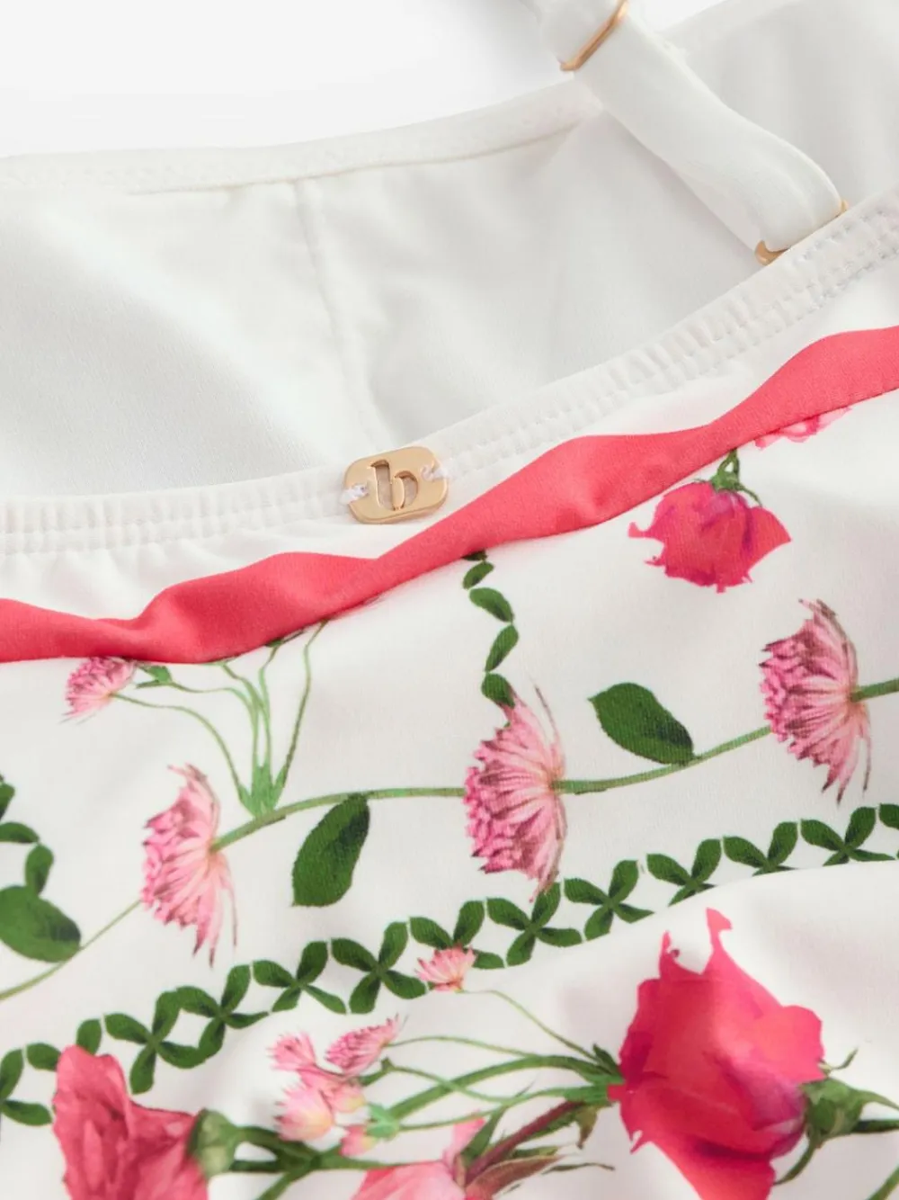 Dive into elegance with the B by Ted Baker Tummy Control Bandeau Swimsuit. This stunning swimsuit features flattering ruched side seams that allow you to adjust the leg height for your perfect fit. Designed with a chic placement print, it offers a sophisticated look for your time by the water. The removable straps provide versatile styling options, letting you switch between a bandeau and strapped silhouette. Complete your resort-ready ensemble with the matching beachwear, available separately. Ruched side seams Removable straps Matching beachwear available Machine washable. Main 85% Recycled polyester, 15% LYCRA® XTRA LIFE™ elastane. Mesh 88% Nylon, 12% Elastane. Lining 92% Recycled polyester, 8% Elastane. Items with the curve logo are available in sizes 18 and above.