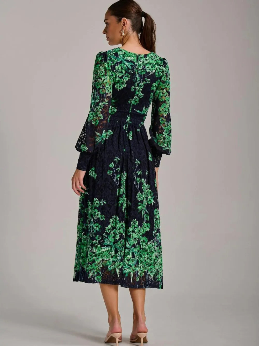 The Long Sleeve Print Lace Maxi Dress by Jolie Moi features an elegant V-neckline and long cuffed sleeves. Made from delicate lace, it falls to a flattering maxi length. Fully lined for comfort and coverage, the dress includes a thick waistband to define the waist, discreet side pockets, and a concealed zip for a seamless finish. Machine washable. 90% Polyester, 10% Nylon.