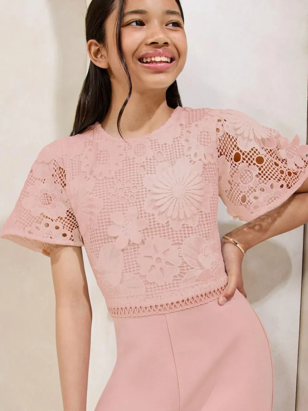 New Lipsy Pink 2-In-1 Flutter Sleeve Lace Occasion Jumpsuit (5-16yrs)