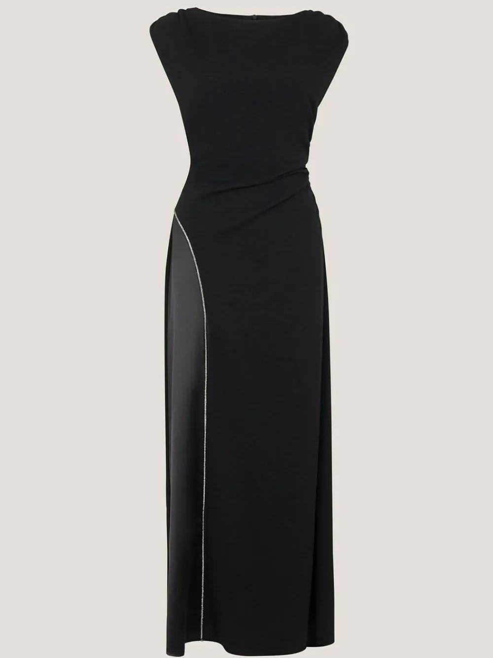 Silhouette of the season. Designed with a sparkle trim satin strip that starts at the hip, this maxi dress features an elegant boat neckline and ruched detailing at the waist. Best styled with glittery jewels and kitten heels, all that’s missing is the invitation. Machine washable. 97% Polyester, 3% Elastane.