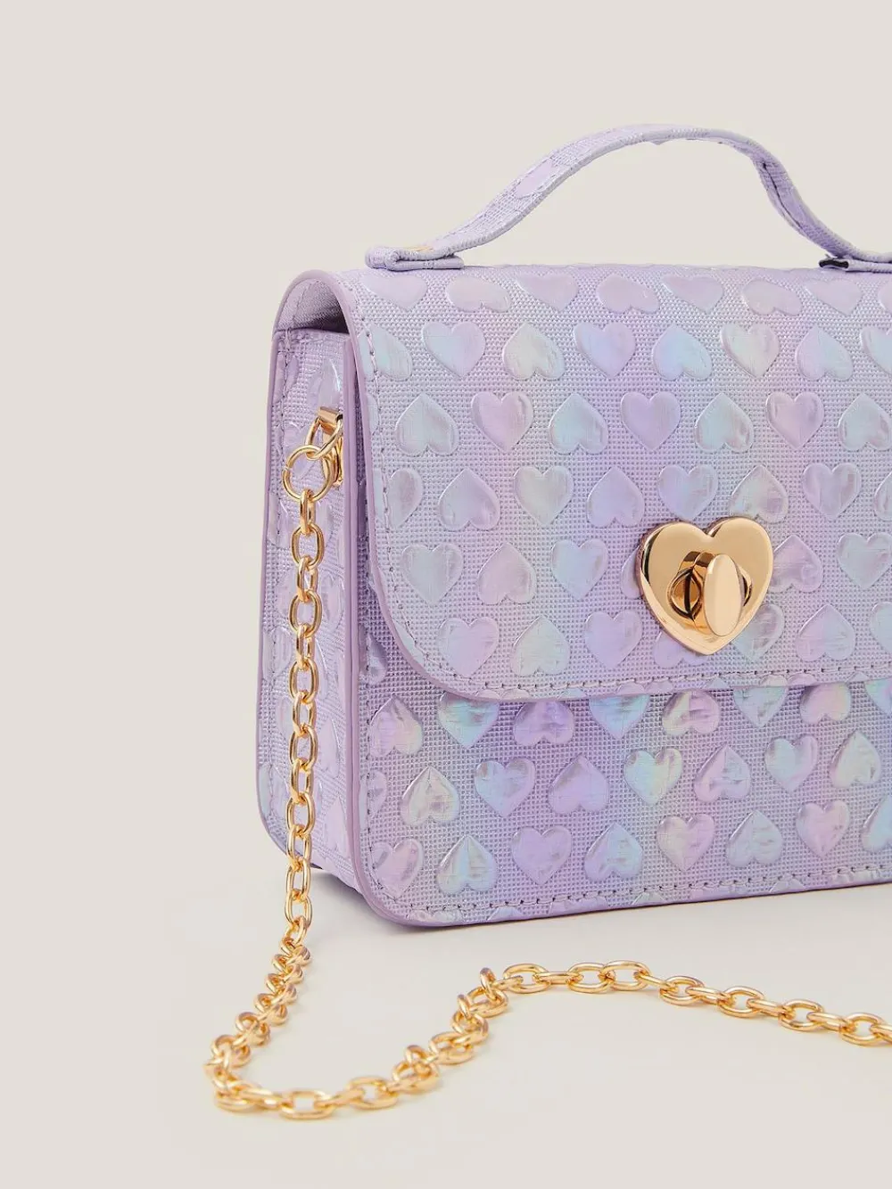 Calling all rainbow seekers! Completely covered in colourful hearts, this bag is a little girl’s dream come true. Designed with a secure push-lock fastening, handle and long chain strap, it’s the ultimate accessory for everyday adventures. Height 12cm Width 5cm Depth 13cm Main 100% Polyester. Sole 100% PU.
