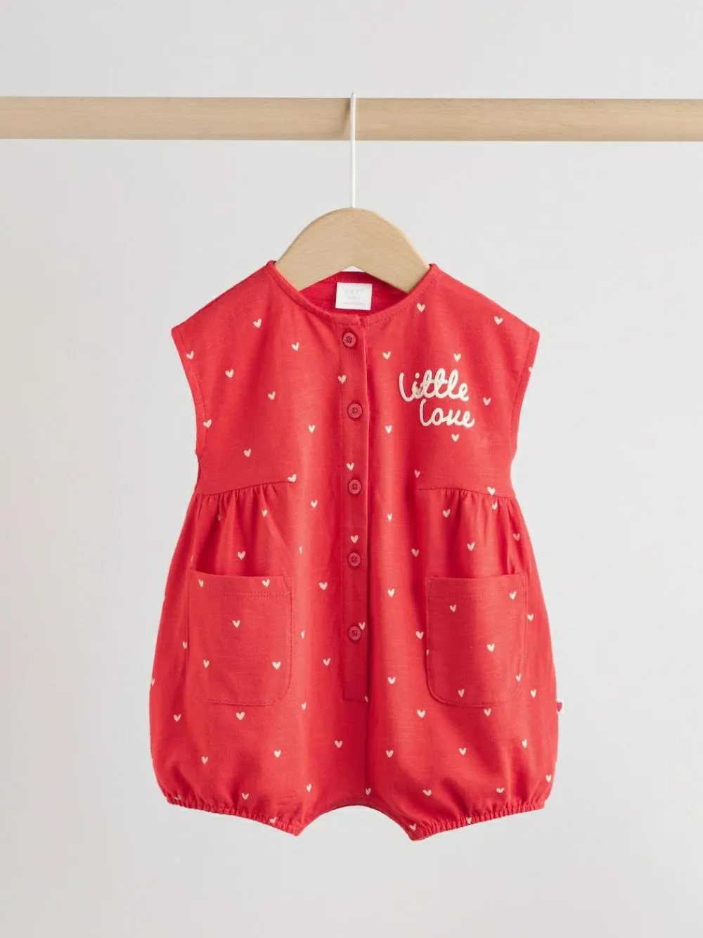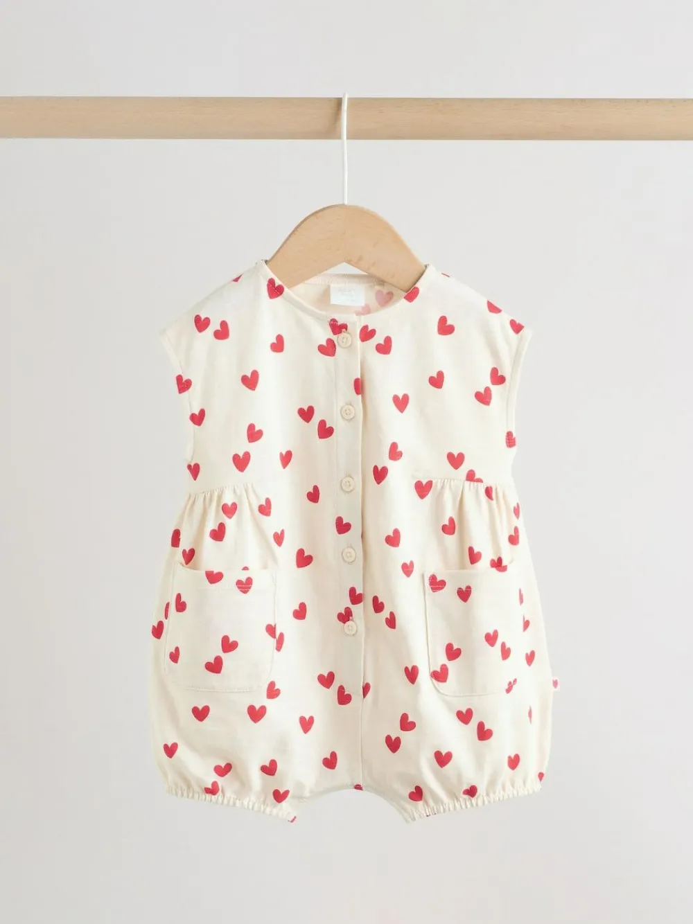 This adorable Red Heart Printed Button Through Rompersuit is a sweet and cosy option for your little one. Featuring all over prints and a puff print front graphic, the romper has practical front pockets, woven side tabs, a button through rompers fastening, and poppers at the leg opening. Puff print front graphic Front pockets Woven side tabs All over prints Button through rompers Poppers at the leg opening Machine washable. 3 x Romper 100% Cotton. Warning: Keep away from fire and flames.