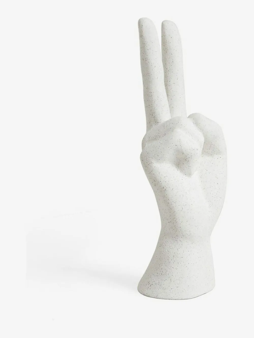 A cool and stylish ornament that is sure to give shelf appeal. This Peace sign hand ornament can be displayed as it is, or can be used as a trinket holder to store your rings and other jewellery items, your watch, or even your headphones. Height 20cm Width 6cm Depth 8cm 100% Stoneware.