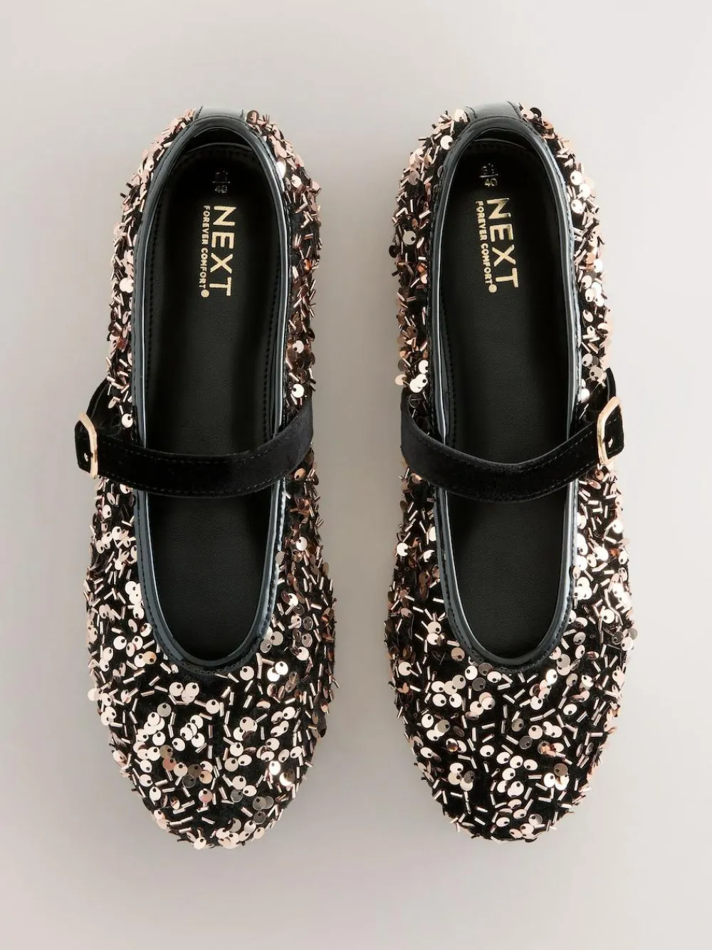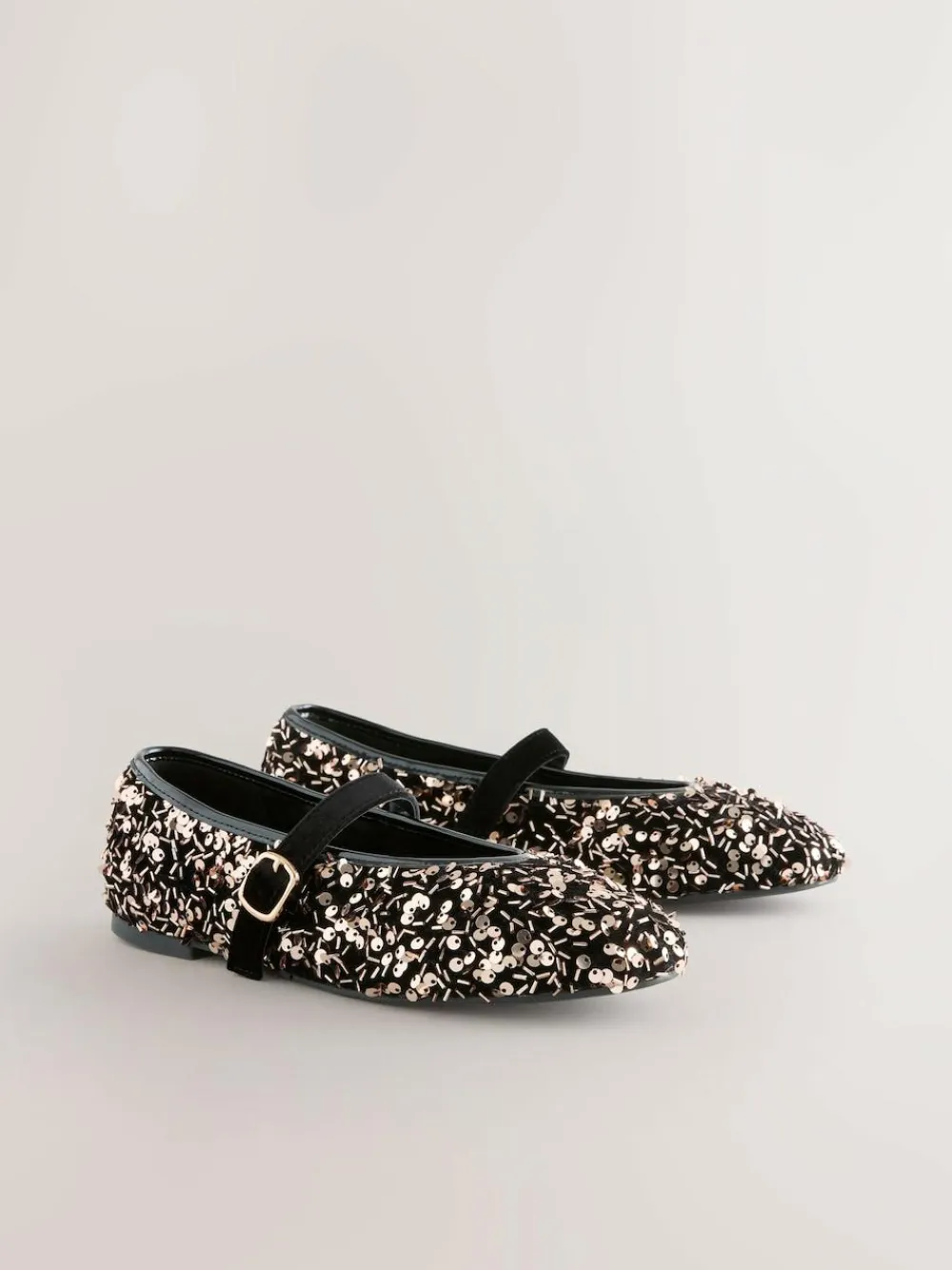 Shine at any event in these dazzling Mary Jane flats. The black and gold sequin upper with a velvet trim adds ultimate glitz, perfect for occasionwear. Featuring Forever Comfort® padding and an adjustable strap with a buckle, you’ll be comfortable and stylish all evening. Forever Comfort® padding Sequin and velvet upper Mary Jane style Adjustable strap with buckle detail Upper – Textile, Lining & Sock – Textile, Other Materials, Sole – Other Materials.