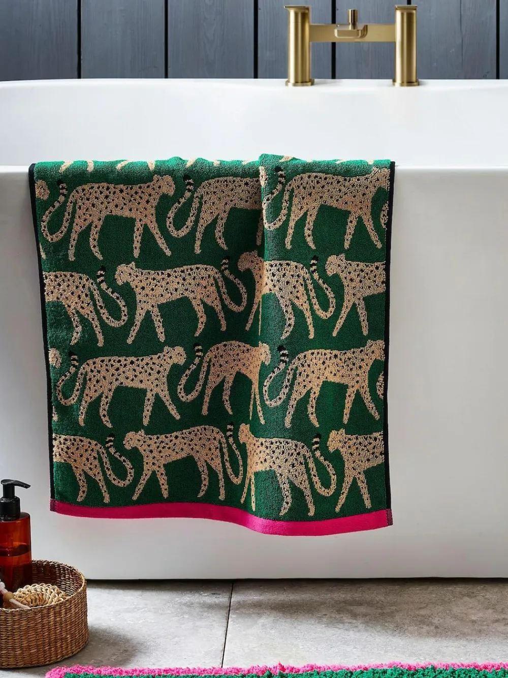 Add this stylish and fun cheetah animal towel to your bathroom. This is the perfect conversational design with its gorgeous green base and pop of pink trim. Matching items available. 100% cotton Cheetah design Pop of pink Hand Towel Length 90cm / Width 50cm Bath Towel Length 127cm / Width 70cm Bath Sheet Length 150cm / Width 100cm Machine washable. 100% Cotton.