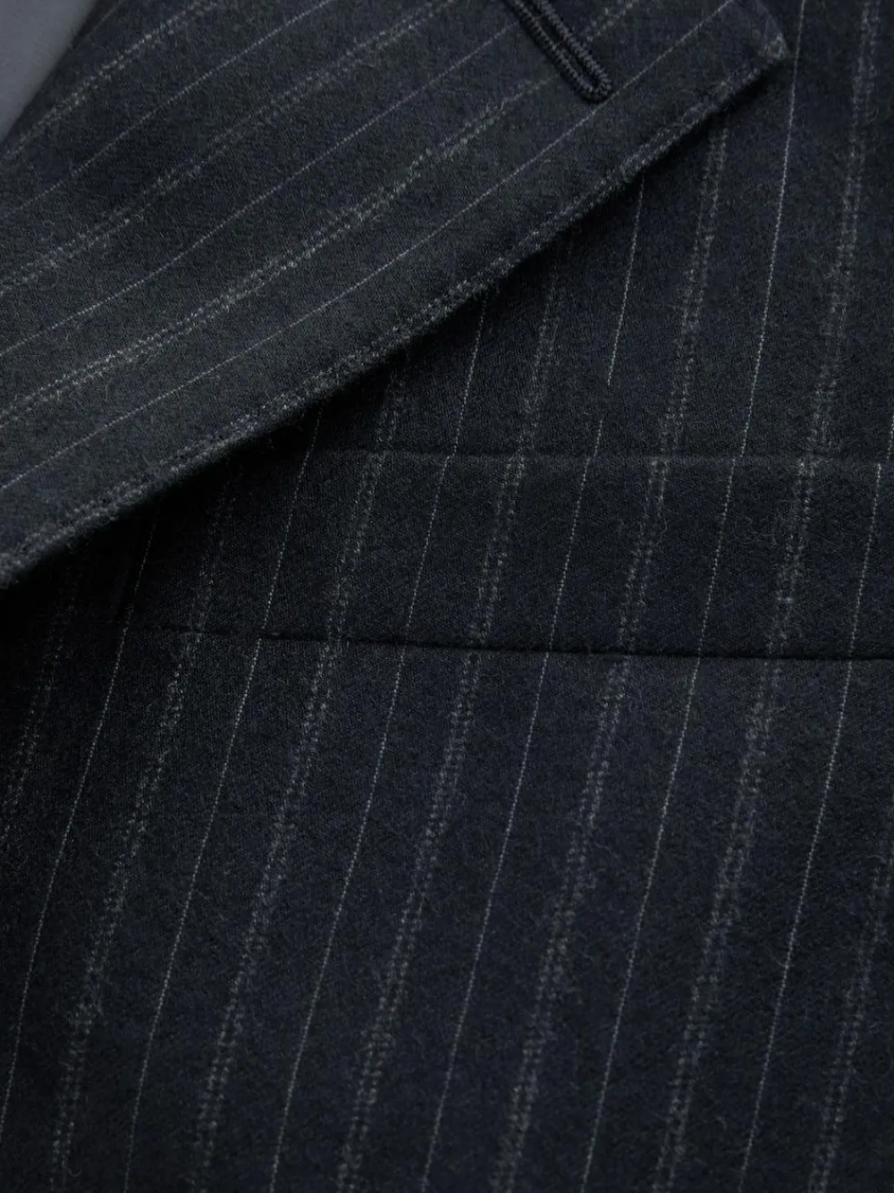 Achieve an authoritative and refined look with the Navy Signature Stripe Empire Mills British 100% Wool Suit Jacket. Crafted from premium wool fabric sourced from the prestigious Empire Mills in Britain, this jacket features a timeless pinstripe pattern over a rich navy base. The tailoring is exceptional, including traditional functional cuffs and a luxurious bespoke jacquard lining. As part of the Signature collection, this jacket offers superior fit and quality, making it an essential piece for any sharp professional wardrobe. Empire Mills Empire Mills was established in Leeds, West Yorkshire in 1915, to produce fine quality worsted cloth for the Military, Police, and Fire Services. Today, Empire Mills remains a family run business weaving and supplying fabrics for Menswear and Ladieswear to Retailers, Tailors and Cloth Merchants worldwide. Signature range Bespoke jacquard lining Traditional functional cuff Main 100% Wool. Lining 55% Polyester, 45% Viscose.