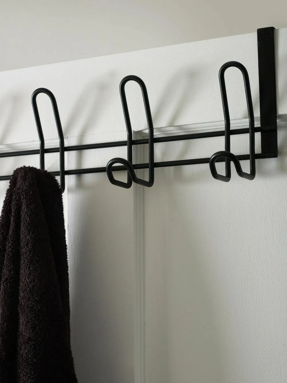 Over the door black hooks, perfect for hanging towels and dressing gowns. Height 18cm Width 45cm Depth 12.5cm This item has been tested to ensure it is bathroom suitable and protects against corrosion and distortion from steam.
