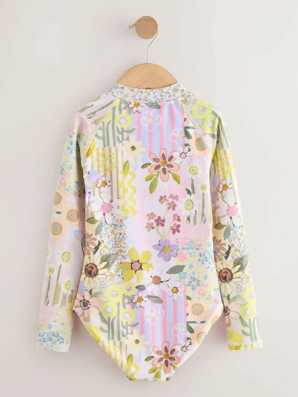 This all-in-one swimsuit provides extra coverage to help protect her from the sun, featuring a zip fastening to the front, long sleeves and a high collar. All-in-one Zip fastening Long sleeves High collar Machine washable. Main 82% Recycled polyester, 18% Elastane. Lining 92% Recycled polyester, 8% Elastane. This fabric will provide protection against solar ultraviolet radiation. It has been independently tested and given a UPF rating of 50+ which blocks more than 97.5% of UV rays. Important Advice: • Sun exposure causes skin damage • Only covered areas are protected • Always use a high protection factor sunscreen on any exposed areas of skin • The protection offered by this fabric may be reduced with use or if stretched or wet • Always rinse in fresh water after each use • Young children should be kept in the shade between 11 and 3 • Don’t forget your hat and sunglasses. • Fabric provides UVA +UVB protection from the sun.