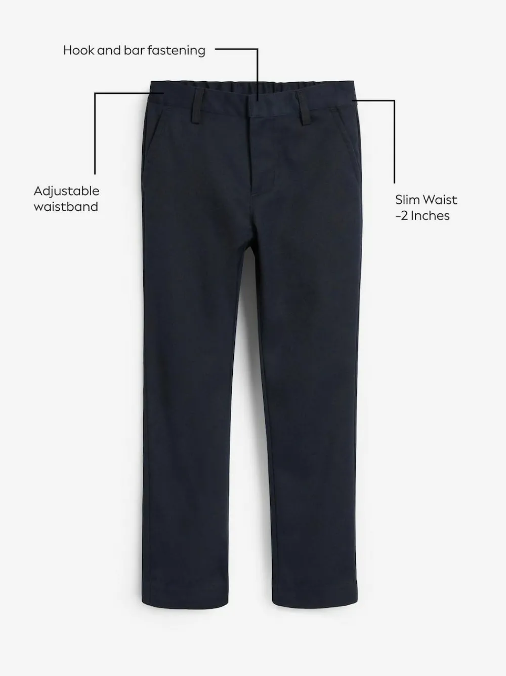 Go back to school in style with our formal straight trousers in navy blue. The adjustable regular fit waist and straight leg silhouette make these flat-front trousers a stylish addition to their school uniform. Made with an easy iron fabric and with a hook and bar fastening with zip fly. Key Features: Easy Iron fabric – Handy easy-iron finish Teflon® Technology – a treatment that repels water and water-based stains for easy cleaning and quick drying Machine washable Adjustable waist Flat front Straight leg style Regular fit waist Machine washable. 65% Recycled polyester, 35% LENZING™ ECOVERO™ Viscose. This product is made with teflon. Teflon® is a registered trademark of DuPont.