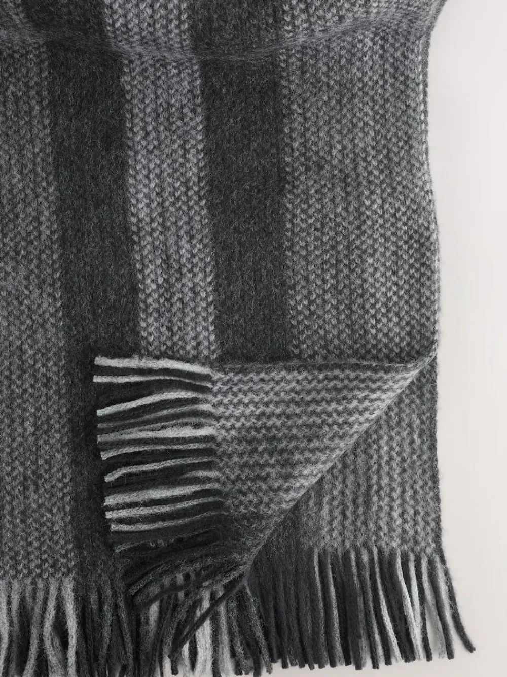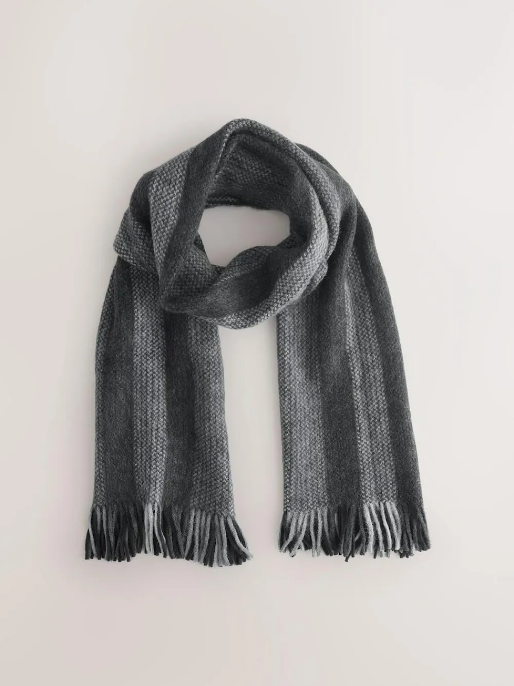 Wrap up for the colder months with this cosy knitted scarf, featuring grey, black and white stripes. Made from a soft blend, its timeless design and versatile style make it a great accessory for any outfit. Perfect for adding an extra layer of warmth, it also makes a wonderful gift. Knitted scarf Soft blend Tassel detail Fringed ends Machine washable. 100% Acrylic.