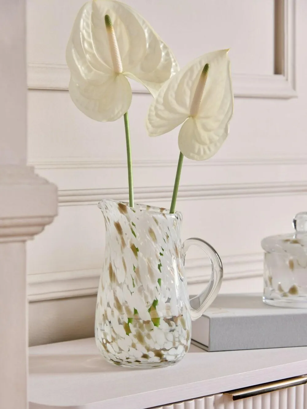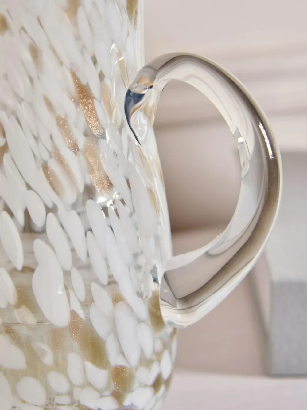 Add a touch of artistic flair to your home with this charming decorative jug vase. The clear glass is infused with a delightful white and gold confetti pattern, creating a unique and eye-catching texture. This piece is designed for decorative use as a vase and is not suitable for kitchen use with food or beverages. Explore our collection for co-ordinating items to enhance your décor. Height 12.5cm Width 16.5cm Depth 2cm 100% Glass.