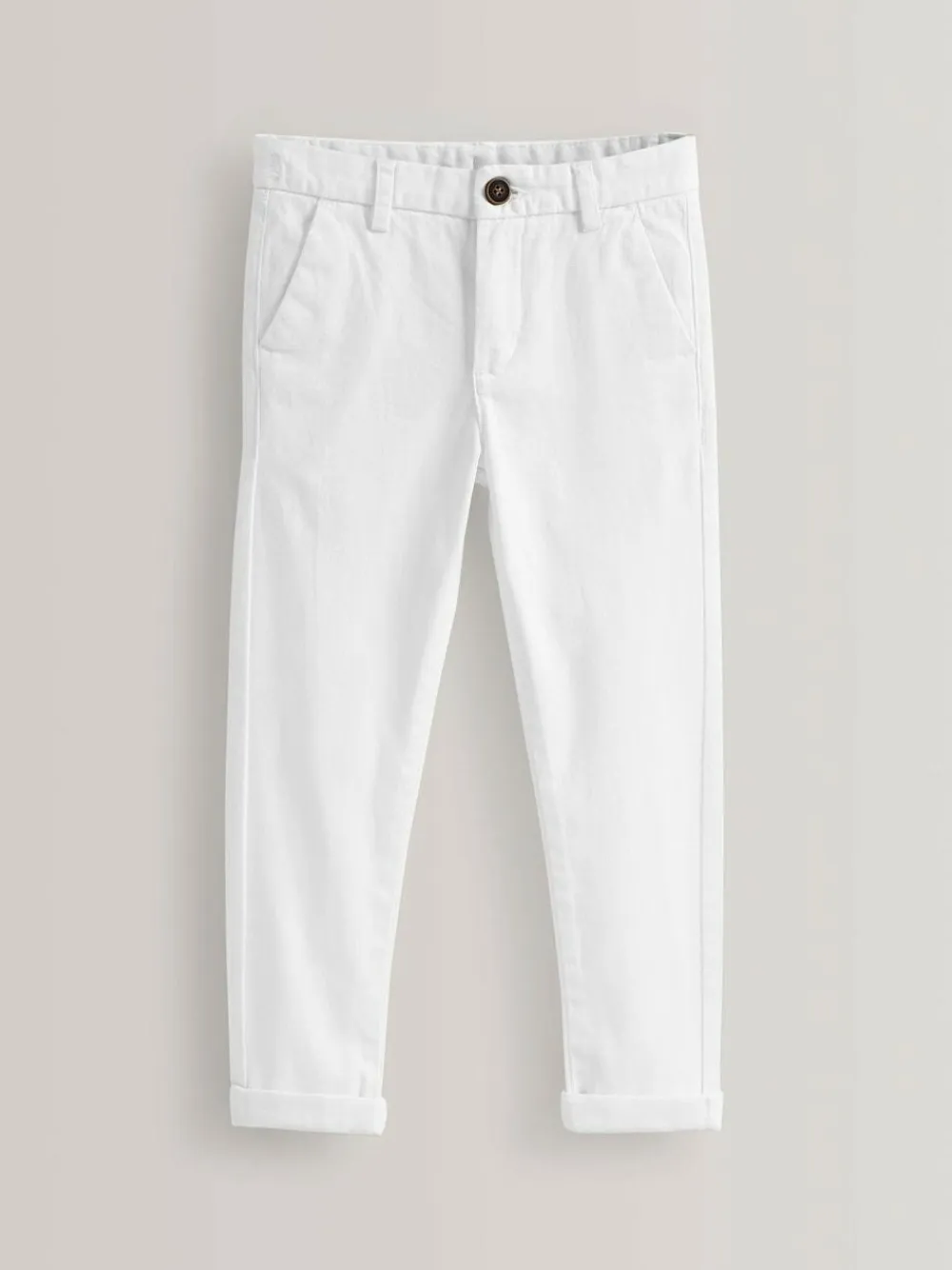 Chino style Skinny fit Cotton-rich stretch fabric Zip fly with button fastening Pockets Belt loops Folded hems Comes in white colour 98% Cotton, 2% Elastane.
