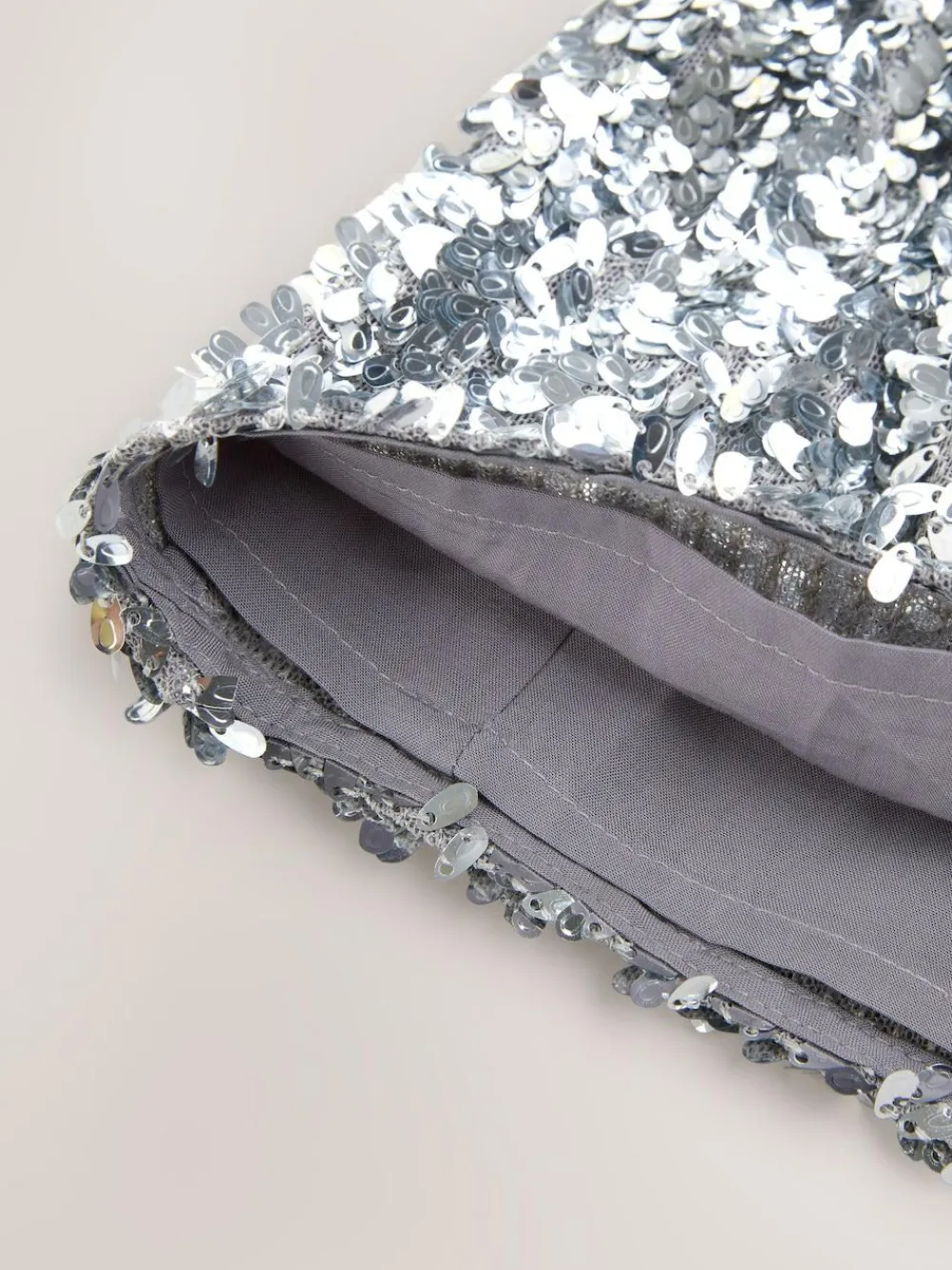 Make a dazzling entrance with the Nothing Ordinary Silver Sequin High Waist Wide Leg Trousers. These are the ultimate party trousers, designed to transform your look and make a statement.Crafted with dense metallic sequins, they shimmer with every movement, creating a captivating effect. The wide leg silhouette and high waisted design offer a sophisticated and flattering fit while the clean zip fly and hook and eye fastening provide a polished finish. Fully lined for comfort, these trousers are perfect for an evening occasion or any event where you want to shine. Wide leg Metallic sequins Fully lined Perfect party trouser Main 94% Polyester, 6% Elastane. Lining 100% Viscose.