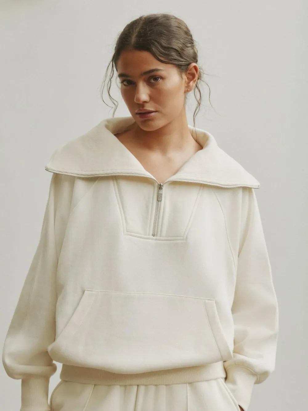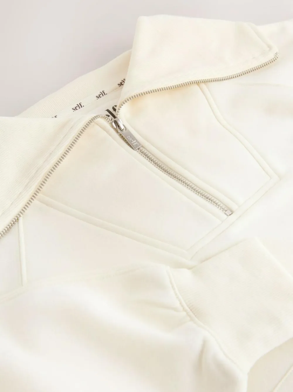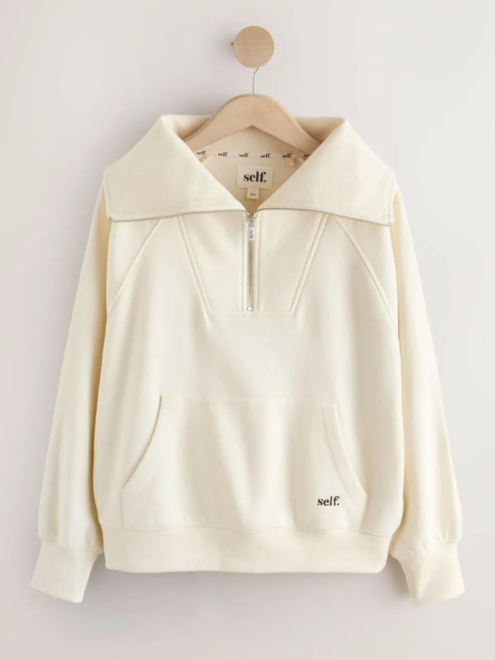 Stay effortlessly cosy with this super soft and comfy ecru half-zip sweatshirt. Designed for a relaxed fit, it features a striking large oversized collar that can be worn open or zipped up for extra warmth. This versatile piece is perfect for layering, with its clean ecru hue making it an easy addition to any casual ensemble. Super soft fabric Large oversized collar Half-zip fastening Kangaroo front pocket Ribbed cuffs and hem Subtle ‘self.’ branding detail on the front Machine washable. Main 55% Cotton, 45% Recycled polyester. Rib 58% Cotton, 39% Recycled polyester, 3% Elastane. Warning: Keep away from fire and flames.