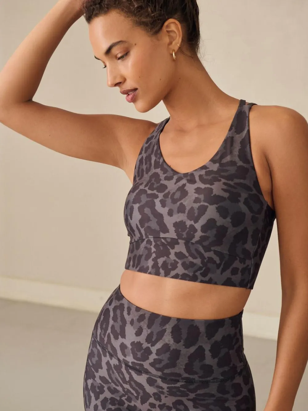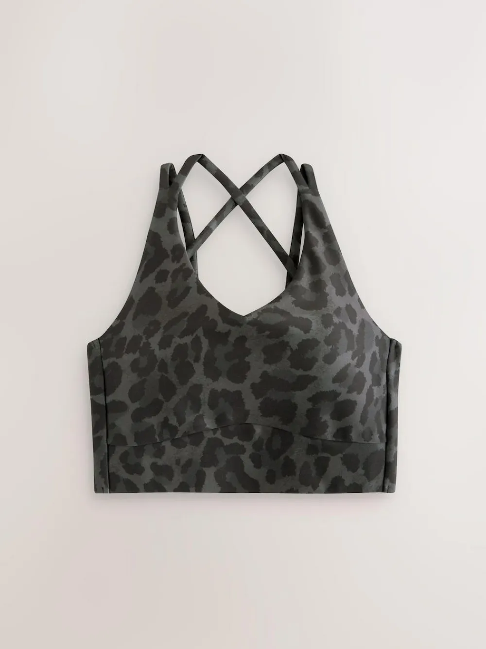Stay supported during your workout with this animal print sports bra. Designed for light support, this Next Active bra features comfortable, adjustable double straps that cross over at the back for a stylish and secure fit. With removable cups and an underbust seam, it offers a perfect blend of comfort and style for yoga or low-impact activities. Light support bra Animal print design Removable cups Cross-over strap detail Underbust seam Scoop neckline Shell 75% Recycled polyester, 25% Elastane. Lining 90% Recycled polyester, 10% Elastane. Mesh 95% Recycled polyester, 5% Elastane.