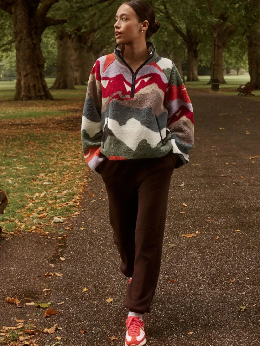 Stay warm during outdoor activities in this vibrant mountain print borg fleece jacket. Featuring a cosy quarter-zip fastening and practical fastened pockets, this piece is perfect for keeping warm during autumn and winter walks or workouts. Borg fleece fabric Mountain print Quarter zip fastening Fastened pockets Machine washable. 100% Recycled polyester.
