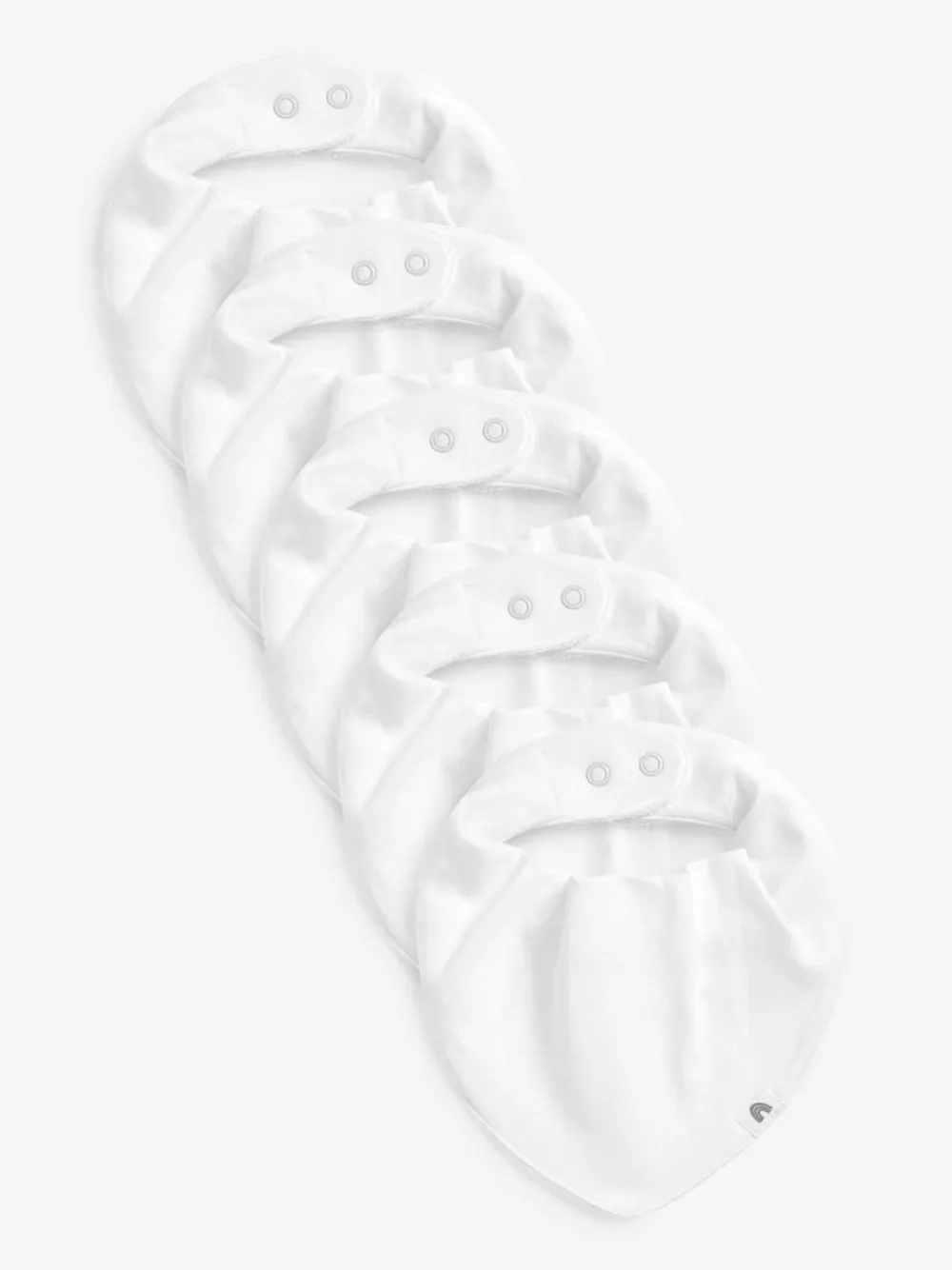 Keep unwanted spills and dribbles at bay with this five-pack of white baby bibs. Made from soft absorbent cotton with a terry towelling backing to keep baby as dry as possible. Designed with an elasticated strap and snap closure at the back for easy on and off. Free from harmful dyes and chemicals keeping baby safe.Pack of 5 Soft absorbent cotton fabric Terry towelling backing Snap closure at back Machine washable. 5 x Bib Main 100% Cotton. Backing 77% Cotton, 23% Polyester. Warning: Keep away from fire and flames.