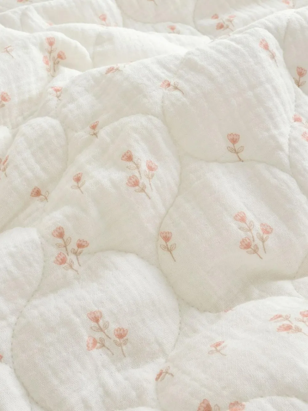 This cosy floral print muslin blanket is made from a soft cotton fabric with stitched quilting and a warm fleece underside, perfect for keeping them cosy in or out of the house, finished with a piped trim. Cotton main Quilted stitching Fleece underside Piped trim Machine washable. Main 100% Cotton. Reverse 100% Recycled polyester. Trim 100% Cotton. Use with caution, particularly in combination with other items of bedding to ensure your baby does not overheat. Do not cover your baby’s face or head whilst they are sleeping. Warning: Keep away from fire and flames.