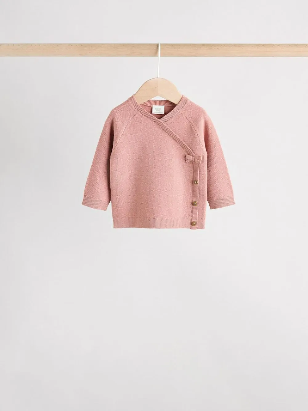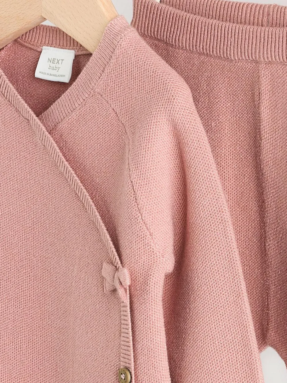 Crafted from soft knitted fabric, both the jumper and leggings offer a gentle touch against the skin, ensuring ultimate comfort and warmth during cooler days. The top features sweet wrap detail and the coordinating leggings have sweet bow detail to complete the look. Wrap jumper and leggings set 2 piece set Soft fabric Decorative bow detail Machine washable. Jumper and Leggings 51% Livaeco™ Viscose, 31% Polyester, 18% Nylon. Warning: Keep away from fire and flames.