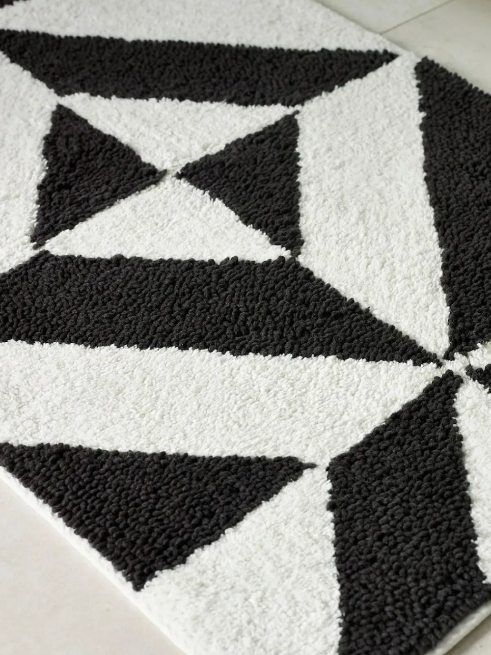 Made from pure cotton, this stylish bath mat has a monochrome geometric design that looks great in any bathroom. Matching towels sold separately. Length 50cm Width 80cm Machine washable. 100% Cotton.