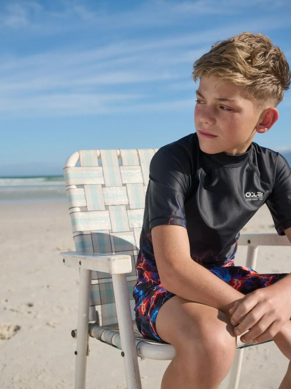 These Black rash vests are made from a lightweight and stretchy fabric with a high neck and has a lightning bolt print. Perfect for the beach, these rash vests have a UPF rating of 50+ on covered areas to protect them from the sun. Age 1.5-2years comes with a zip at the back neck for easy dressing. Short or long-sleeve Lightweight Stretchy fabric Lightning bolt print High collar UPF rating of 50+ Zip at back neck on age 1.5-2years Machine washable. 82% Recycled polyester, 18% Elastane.