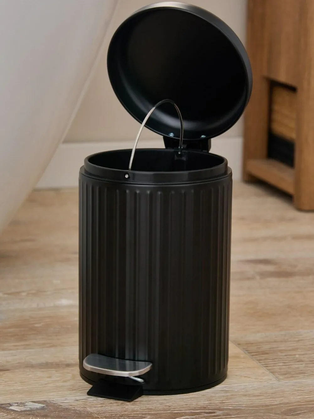 Our Black 3 Litre pedal bin is a designed with a stylish rib finish and is the perfect practical addition to any bathroom or small space. With a soft close lid and handy carry handle, this bin also features a removable inner section for easier emptying.3 Litre capacityRib designPedal openingPerfect for the bathroomRemovable inner section Height 26cm Width 17cm Depth 17cm 62% Metal, 26% Plastic, 12% Stainless steel. This item has been tested to ensure it is bathroom suitable and protects against corrosion and distortion from steam.