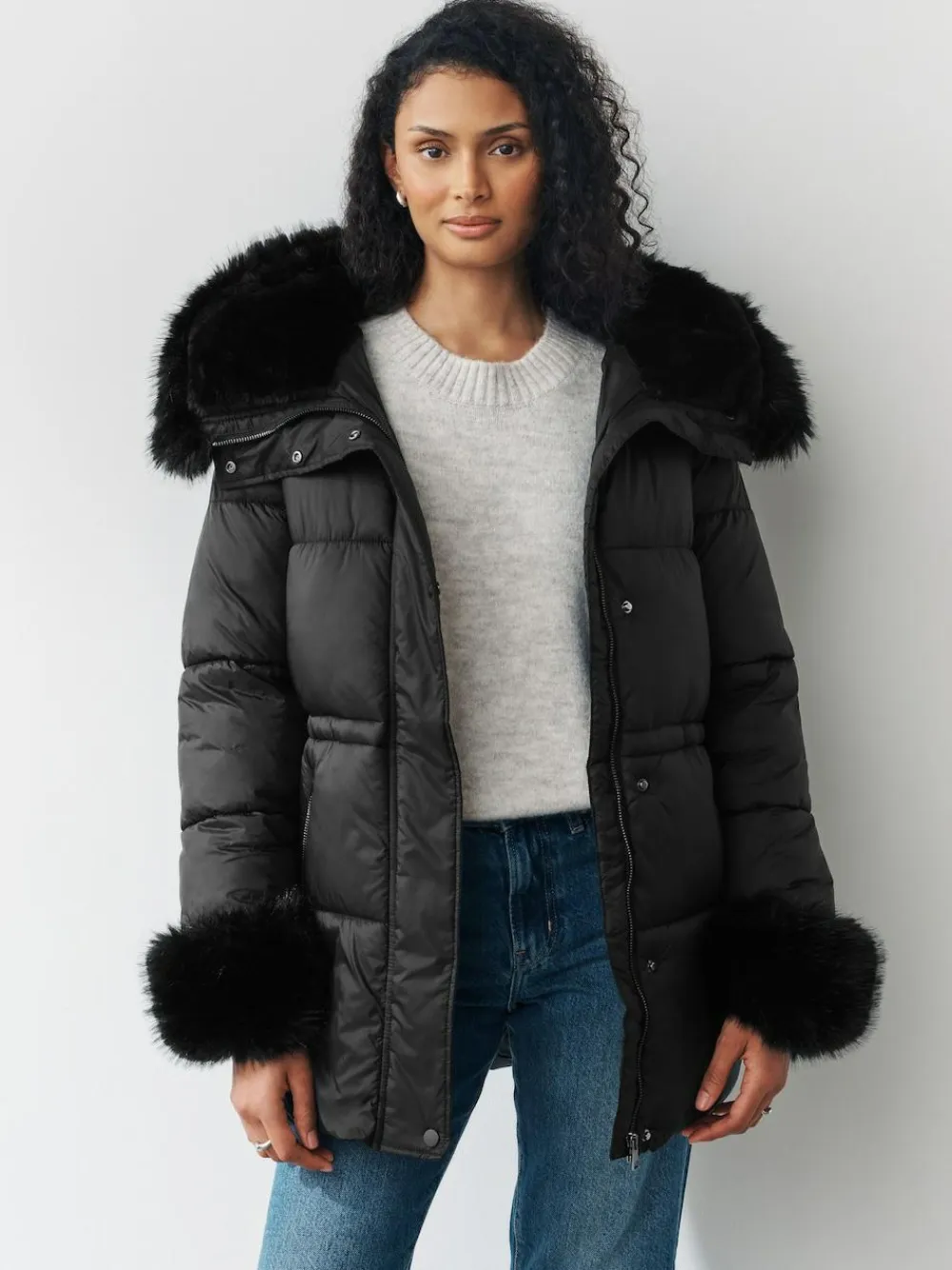 Next Black Short Padded Coat with Faux Fur Trim Hood and Cuffs^Women Coats & Jackets|Coats & Jackets