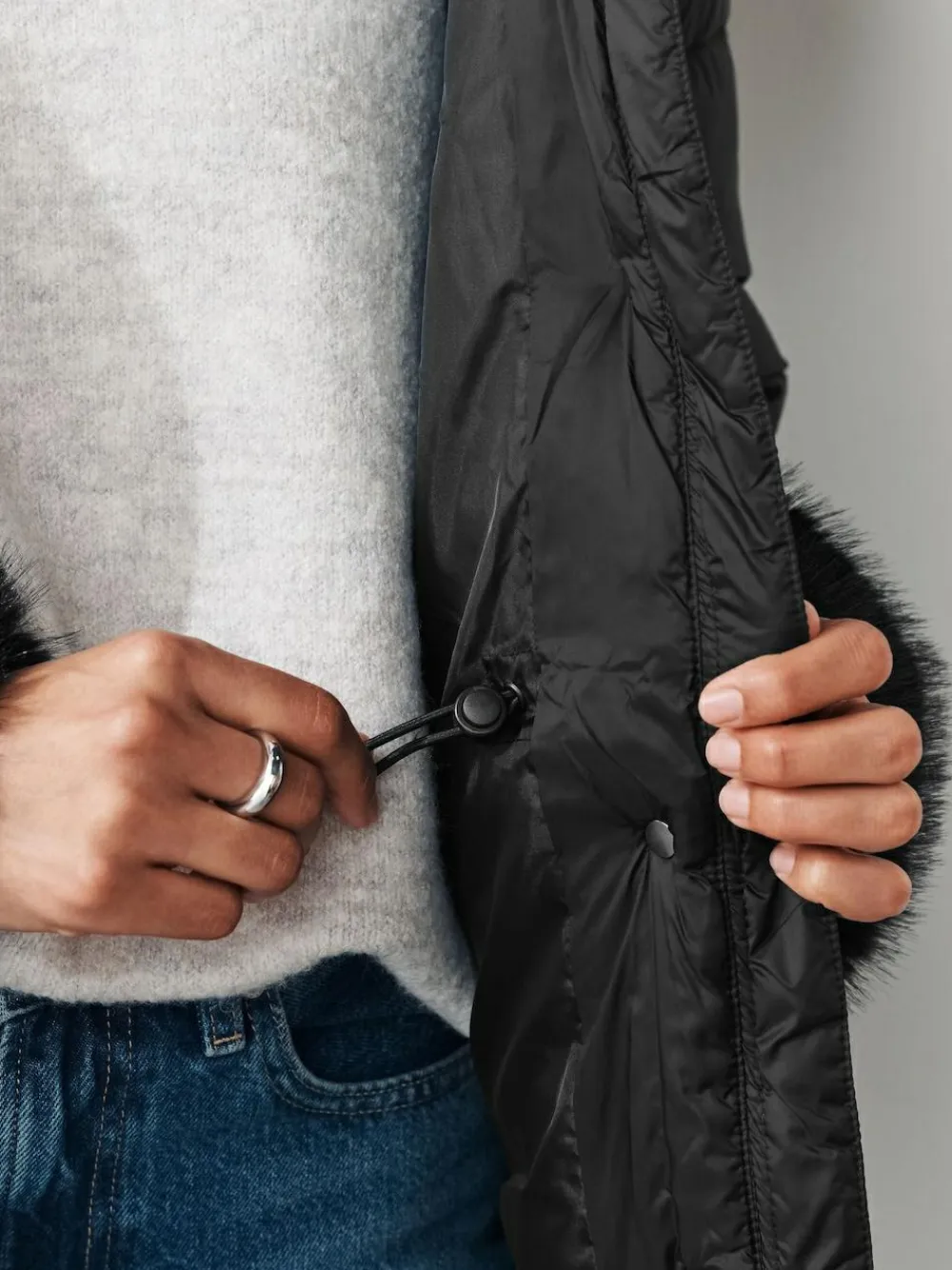 Stay warm in style with this sleek black padded coat. Featuring a cosy faux fur trim on the hood and cuffs, the internal drawstring cinches the waist for a flattering fit. The fur cuffs are removable for versatile winter styling. Coat Padded design Faux fur trim hood Faux fur trim cuffs (removable) Internal drawcord Zip fastening Regular centre back neck to hem 30″ / 76cm. Main 100% Nylon. Lining 100% Recycled polyester. Hood 100% Recycled polyester. Cuffs 100% Recycled polyester. Hood Lining 100% Recycled polyester. Wadding 100% Recycled polyester.